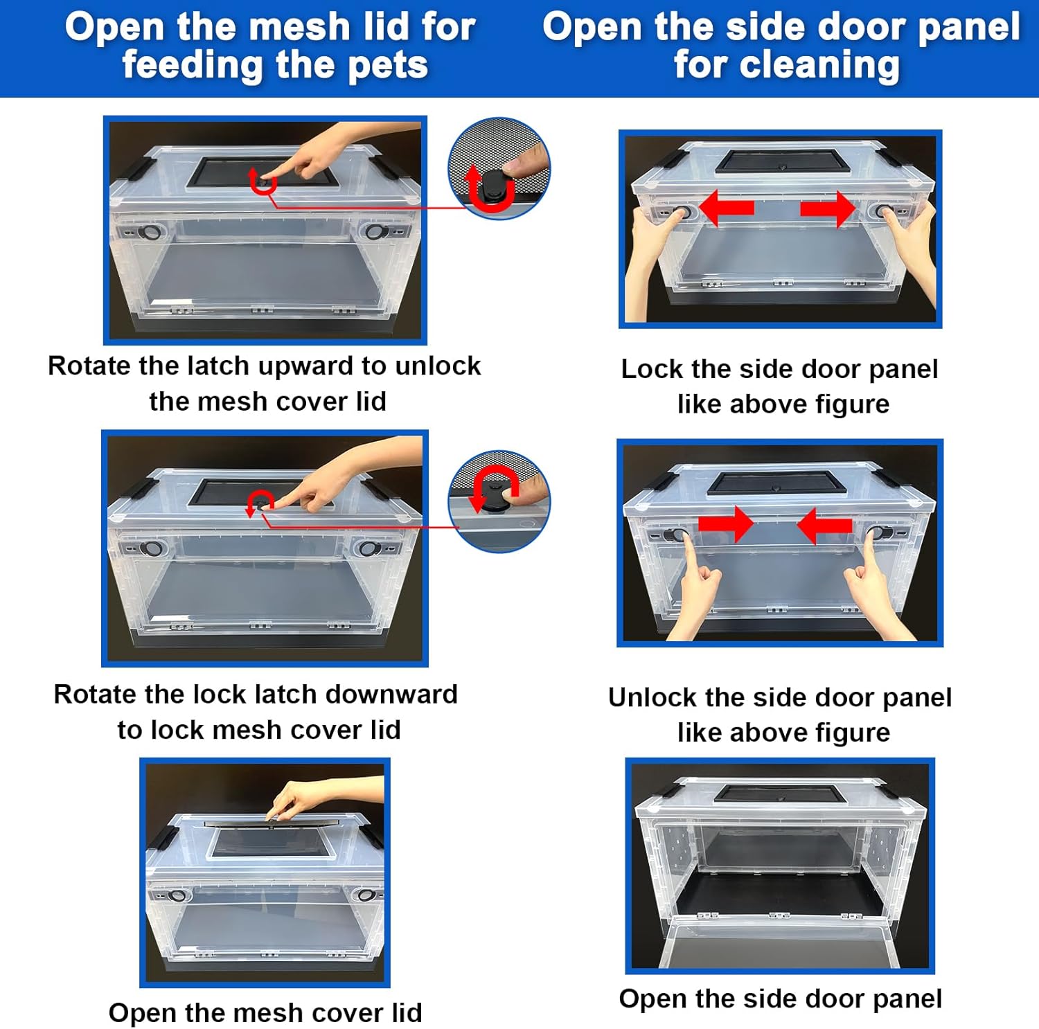 - 【Flexible opening and closing cover and side door】The top mesh lid can be opened and closed for better air flow and easy pet feeding;The Front panel can be opened and closed for easy cleaning of pet house