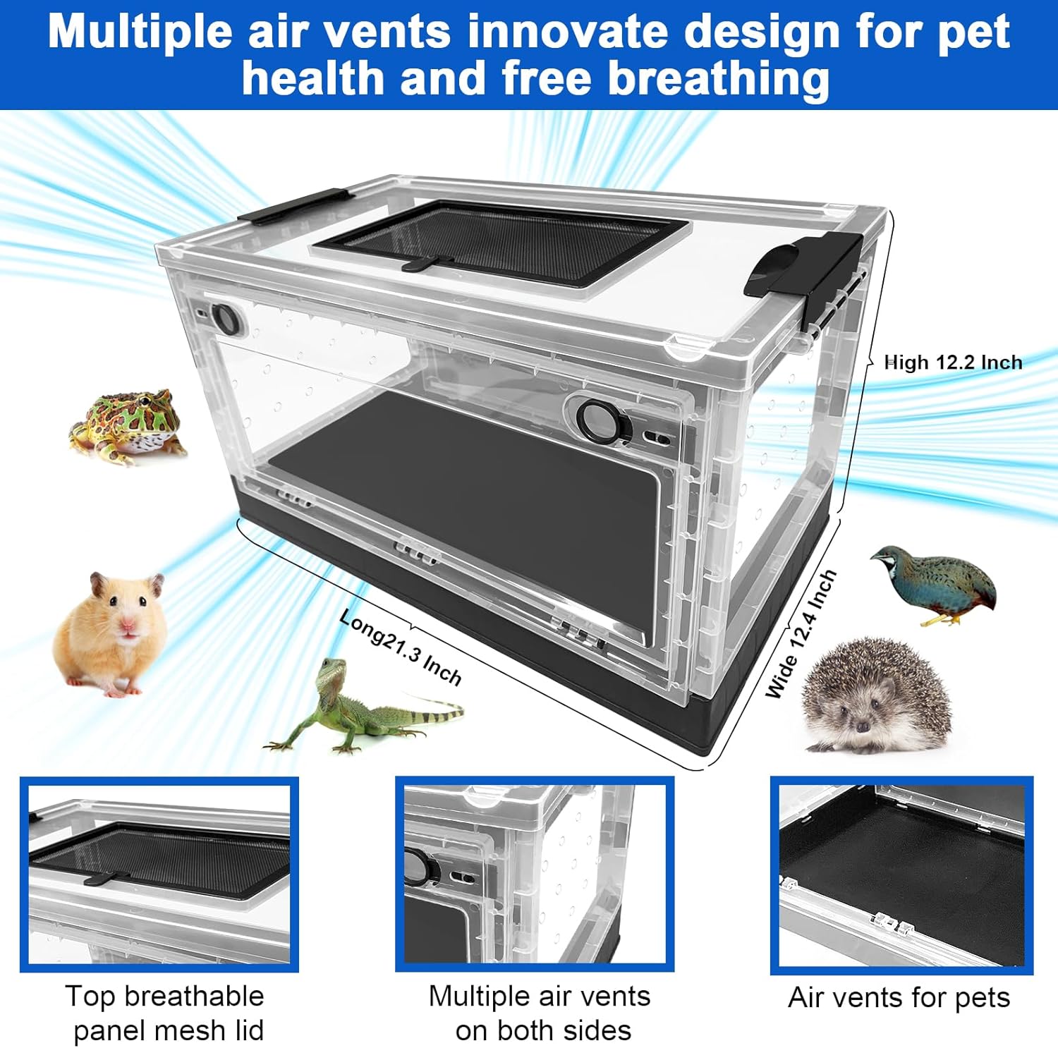- 【Innovate design for pet health and free breathing】Our reptile and small animal cage for breeding house has top breathable panel mesh lid,multiple air vents on both side and air vents on bottom for better air circulation and flow which let the pet in product have free breathing