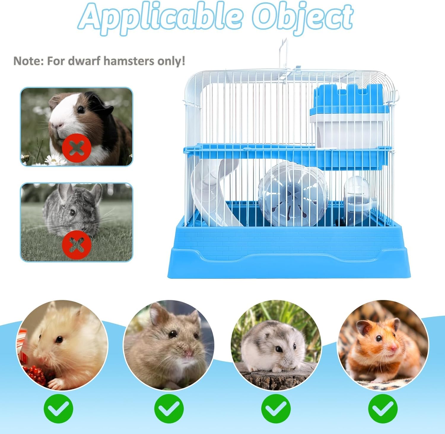 - Applicable Object:Portable hamster cage size is 11.7*8.7*9.8in, this cage is not suitable for chinchillas, guinea pigs and other larger pet rats, it is suitable for small hamsters, gerbils, roborovski rats and other dwarf rats
