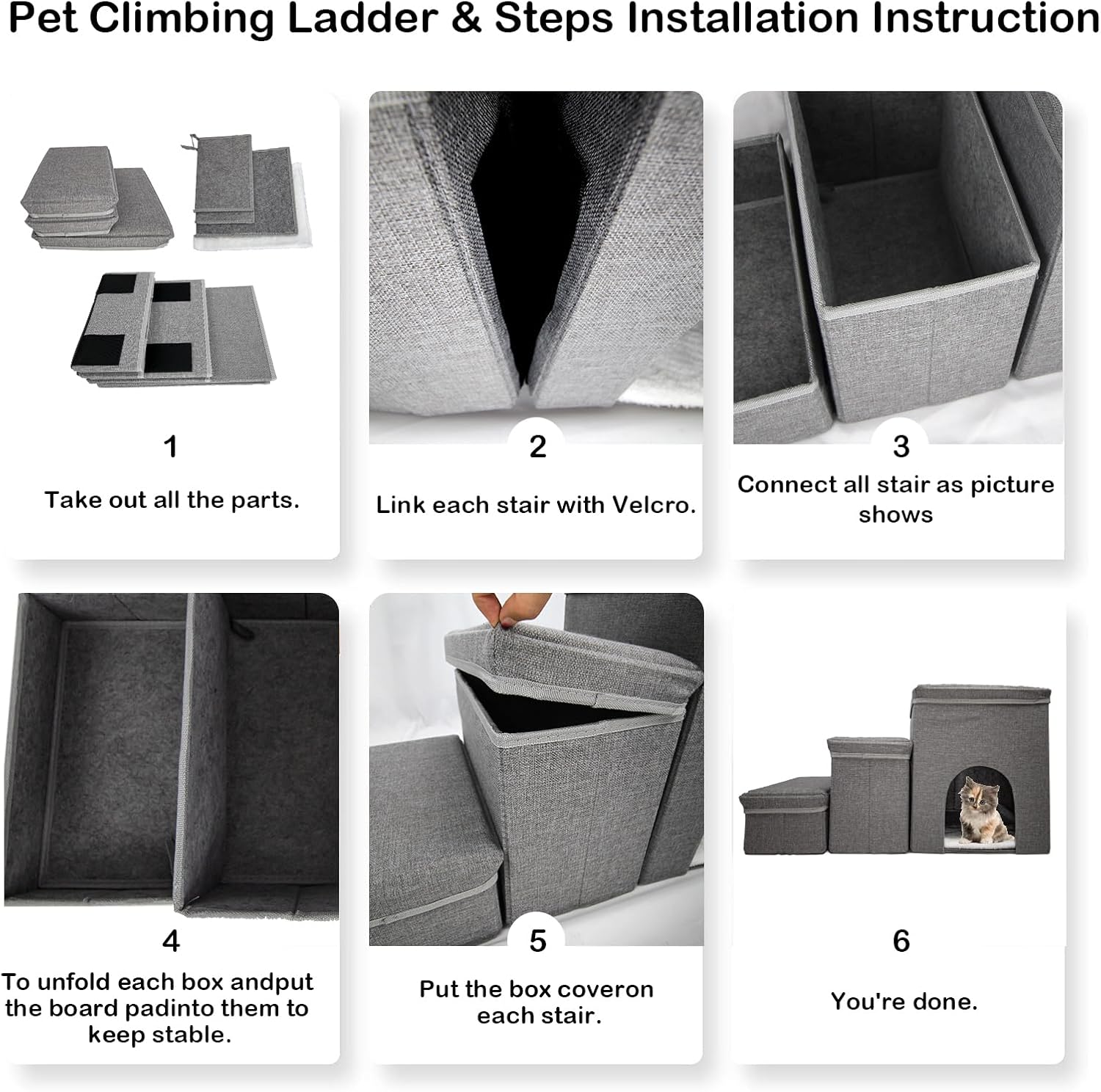 - Easy to Assemble: it only takes you a couple of minutes to assemble these dog stairs – take out all subjects, expand the stairs and put in plates, then the lids which make up the top of the stairs get put on.