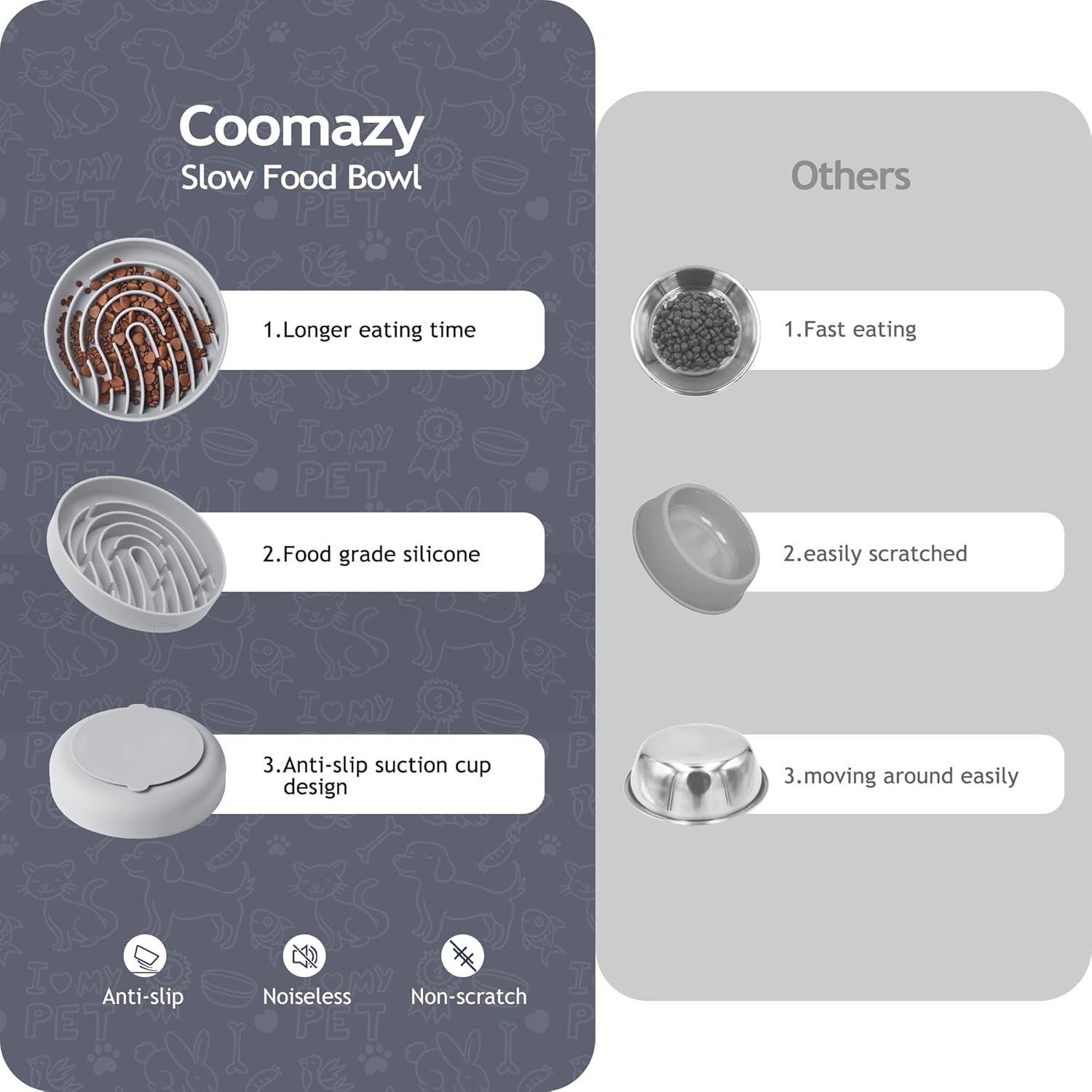 - Crafted from food-safe silicone, these bowls are heat-insulating, high-temperature resistant, anti-slip, waterproof, and durable against tears and bites. Free from BPA, PVC, phthalates, and lead, the soft material ensures your pet's teeth remain unscathed.