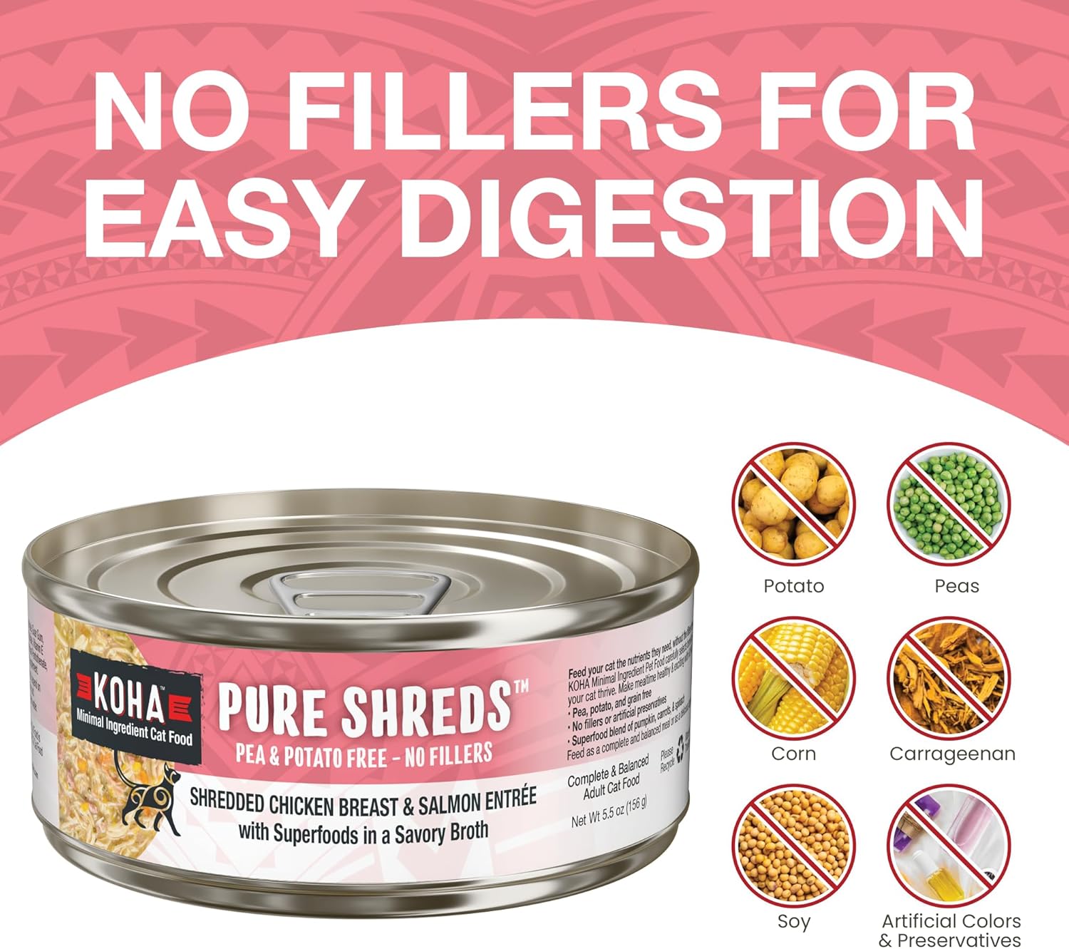 KOHA Pure Shreds Chicken and Salmon Entrée for Cats, High Protein Wet Cat Food, 5.5oz Cans (Pack of 12)