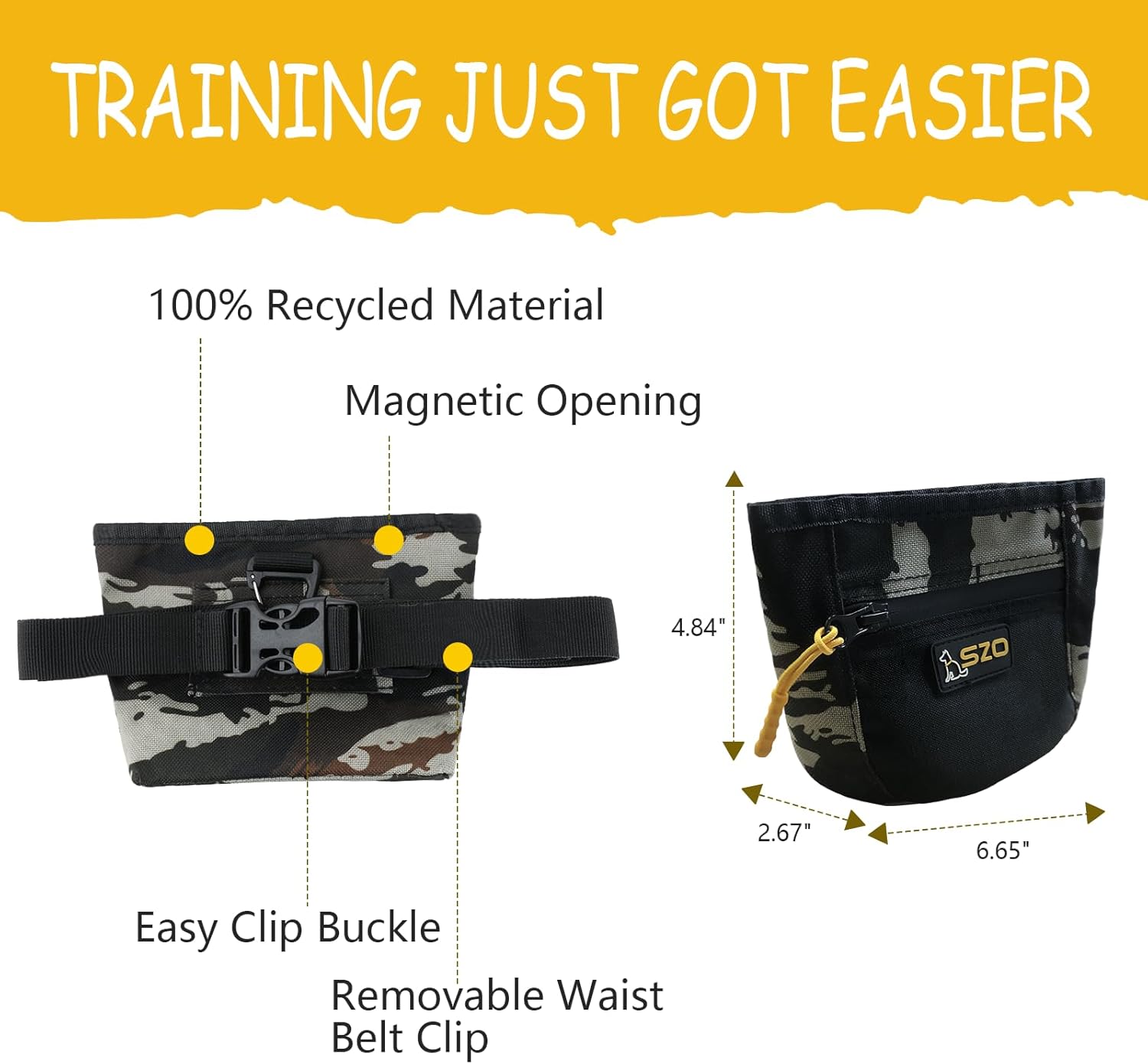 - Easy To Use — SZO dog treat pouch is designed to fit your everyday use when training your pets. It features a magnetic closure, allowing quick and one-handed access to your pet's favorite treats. And a front zipper pocket to secure personal items!