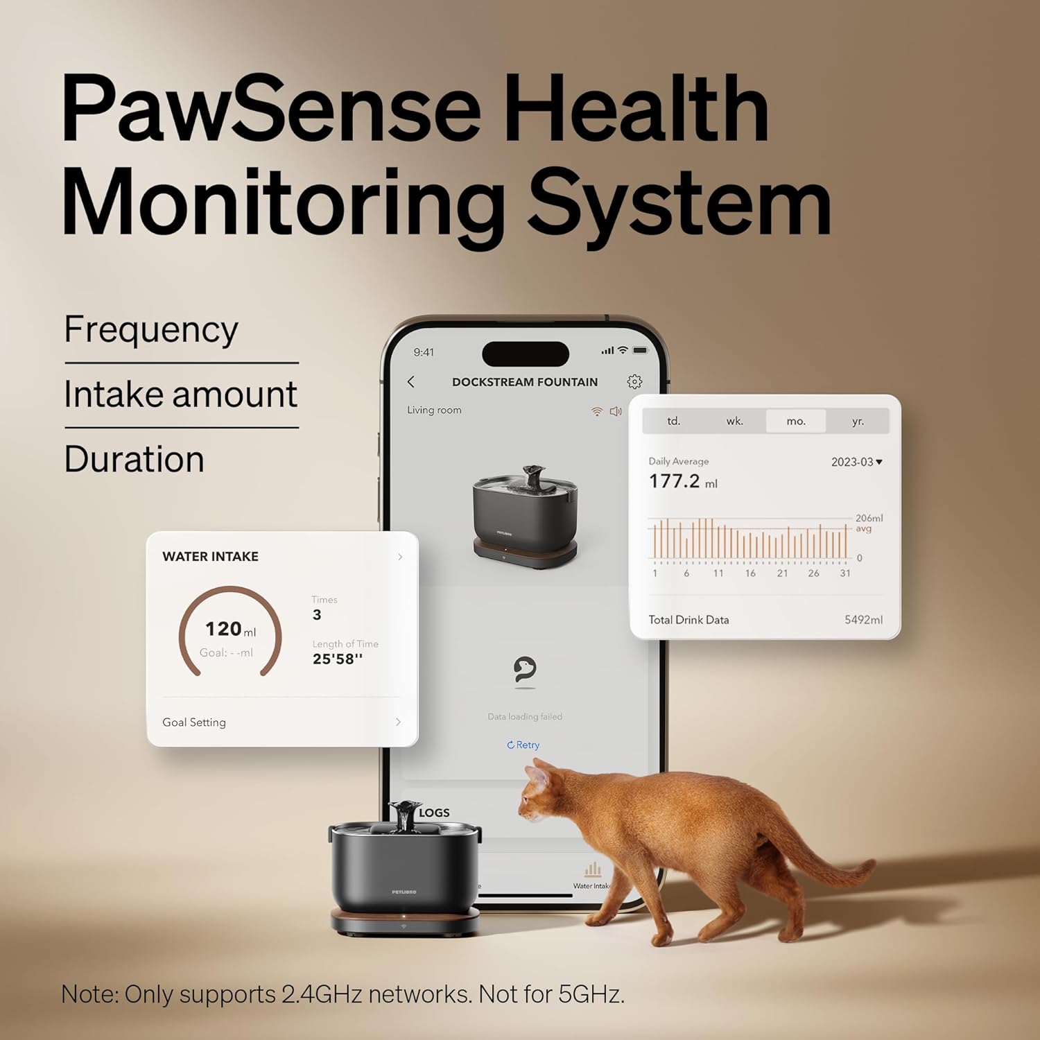 - PawSense Health Monitoring System: The PETLIBRO app of the Dockstream Wi-Fi pet water fountain uses this system to comprehensively record hydration data and provide you with access to clear and easy-to-read reports, ensuring your cat is healthy. (The water fountains for cats indoor only support 2.4GHz Wi-Fi networks, 5GHz networks are not supported.)