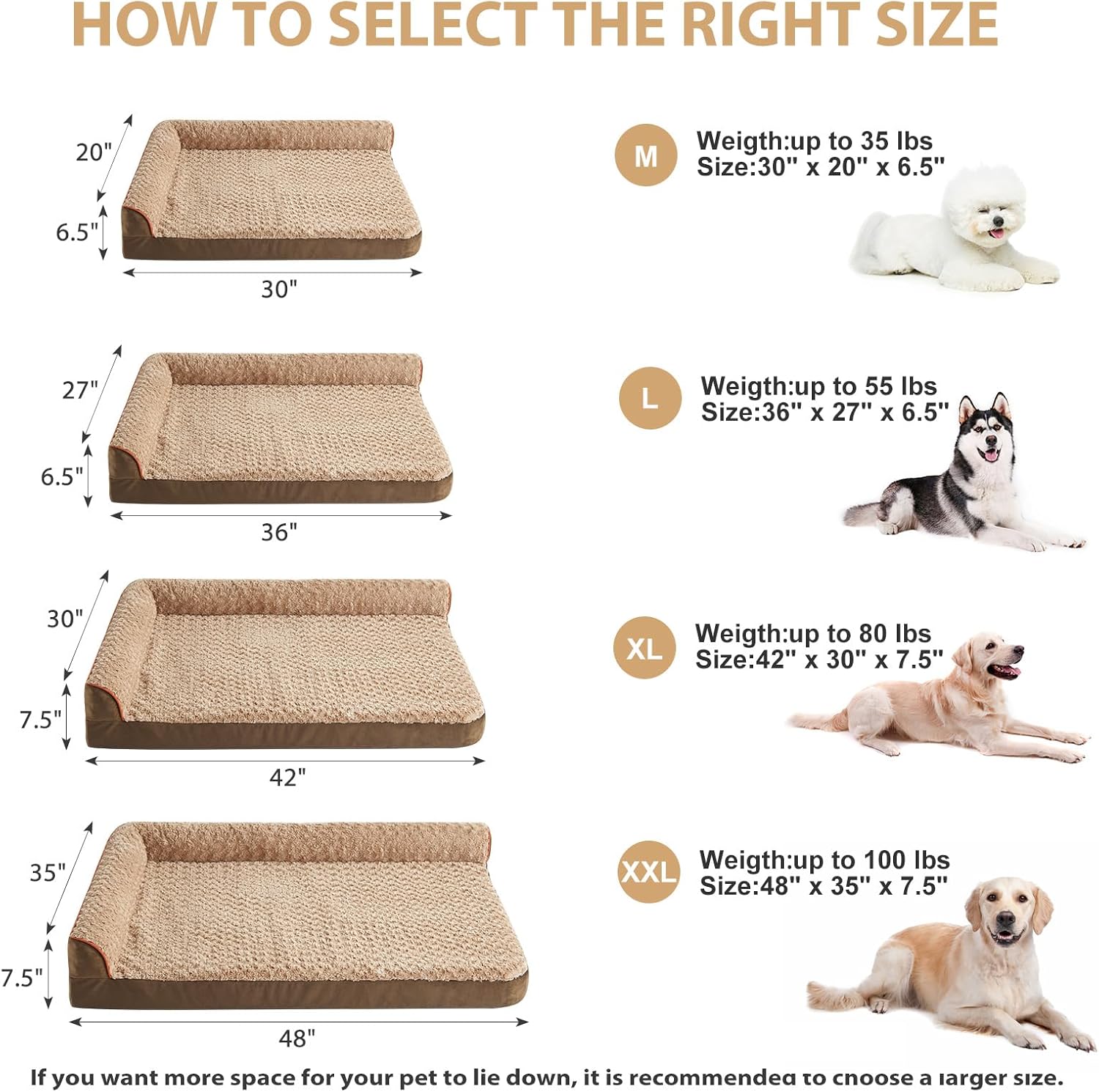 - SIZE(DOG BEDS FOR LARGE DOGS): The dimensions of this L dog bed are 36“ x 27" x 6.5". Large dog beds for large dogs up to 55 lbs. If you want more space for your pet, it is recommended to choose a larger size dog bed.