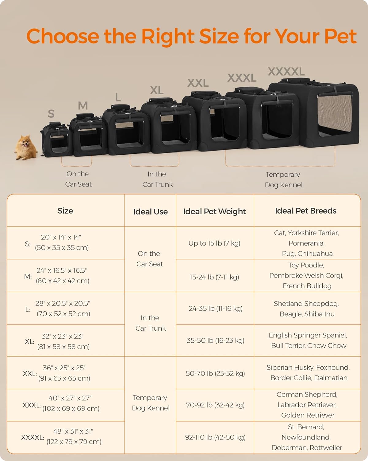 - 【CHOOSE THE RIGHT SIZE】This 48" x 31" x 31" collapsible dog carrier is ideal for pets between 92-110 lb. Please read our tips on the pictures to measure your pet and choose the right size