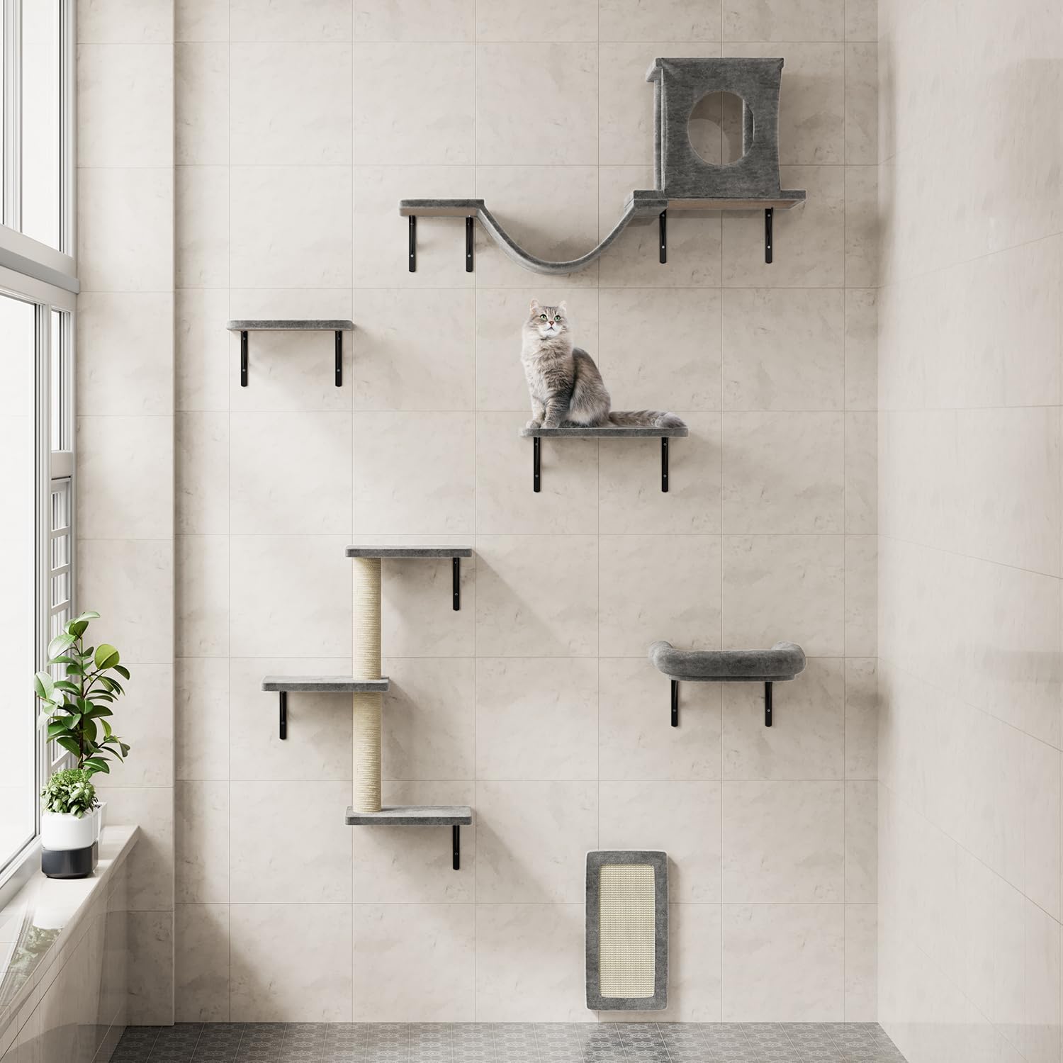 NUNU LAB Cat Wall Shelves, 6 Pcs Luxury Wall-Mounted Cat Climber Set, Indoor Cat Furniture with 1 Condos House, 2 Cat Wall Shelves, 1 Scratching, 1 Bridge Ladder, 1 Scratching Pad, Dark Gray