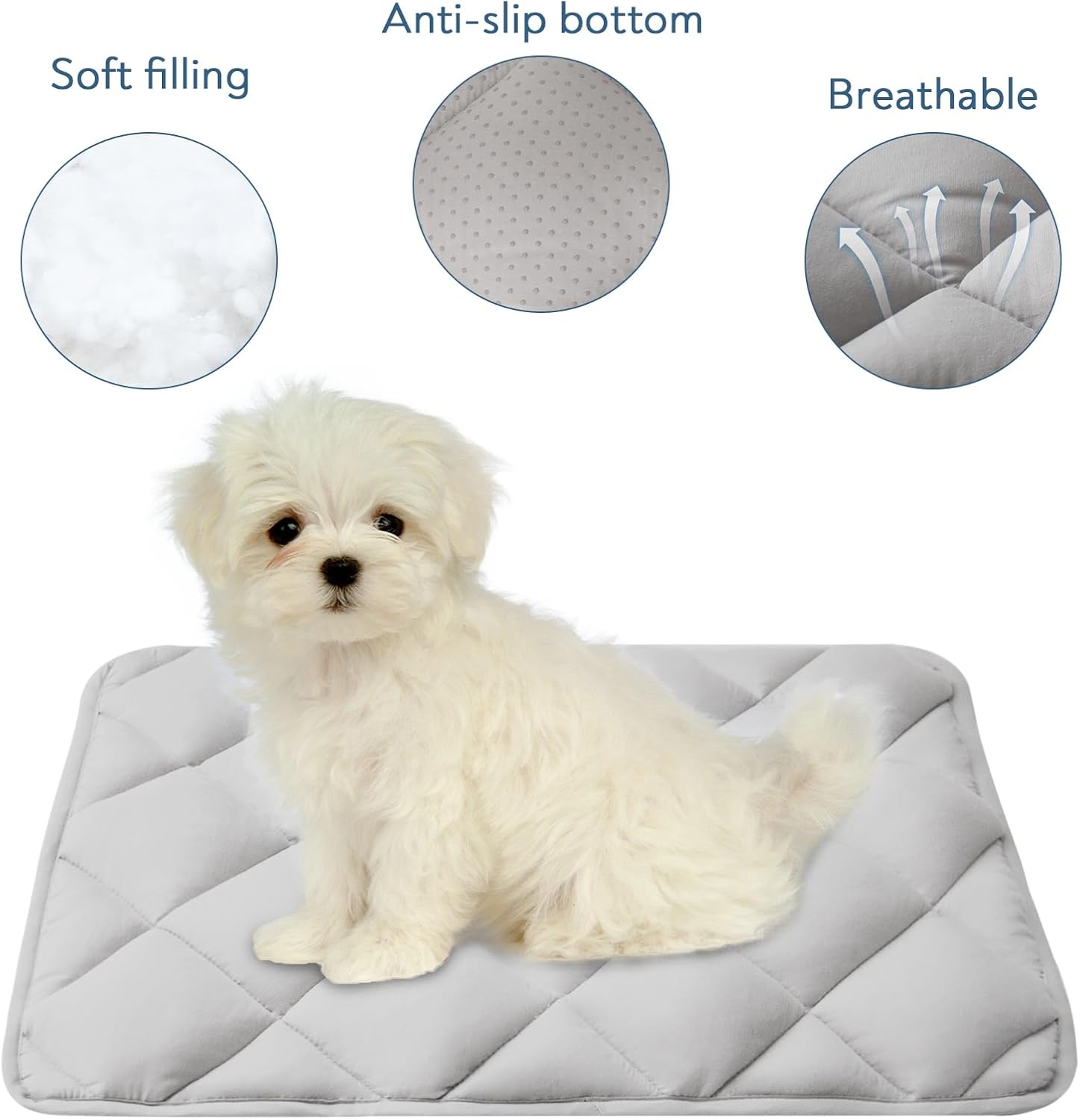 - Comfortable Material: Soft polyester material top surface, middle is filled with soft polyester, which is not easy to deform, polyester knitting fabric with anti-slip silica gel bottom. This crate pads for dog cages can also help them ease anxiety and protect their joint well.