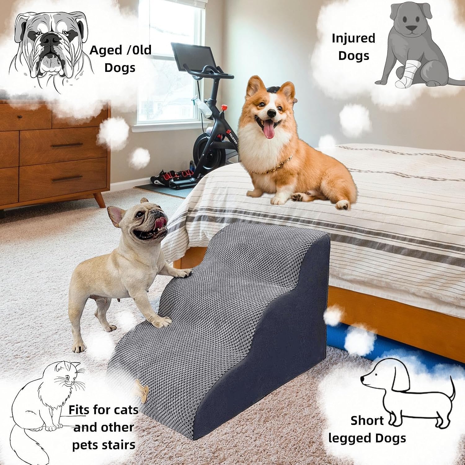 - 【Protect the Dog's Joints & Knees】: Unlike right-angle dog steps, our dog bed ramp features a 35° curved design. Dog Steps wide and deep steps help reduce stress on pet's joints and effectively reduce the height difficulty of pets jumping around on indoor or bedroom furniture, suitable for small/puppy/medium/arge/extra large dogs/short-legged dachshunds/injured/dogs with limited mobility, cats and older pets. Provide better care and let pets interact with you with dog steps for high bed sofas