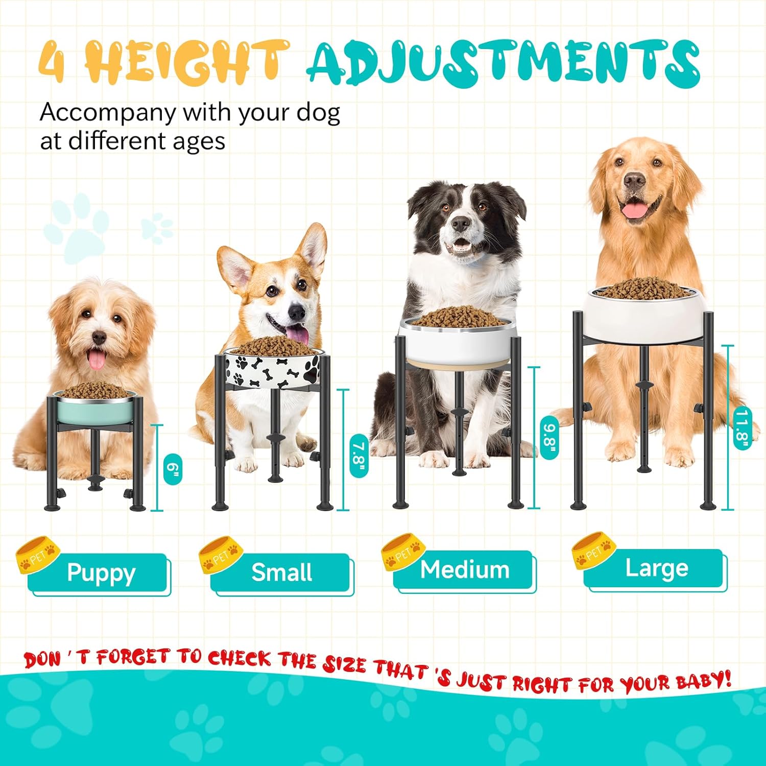 - Height & Width Adjustable Design: This elevated dog food bowl stand will accompany with your dog at different ages, with 4 adjustable heights(8”/10”/12”/13.8”),adjusted in width 6-10”, ensuring that your dog eats in a healthy and safe way at all times; Every time the height of the dog food bowl stand increases it means that the dog has grown a little bit more with you, what an unforgettable moment
