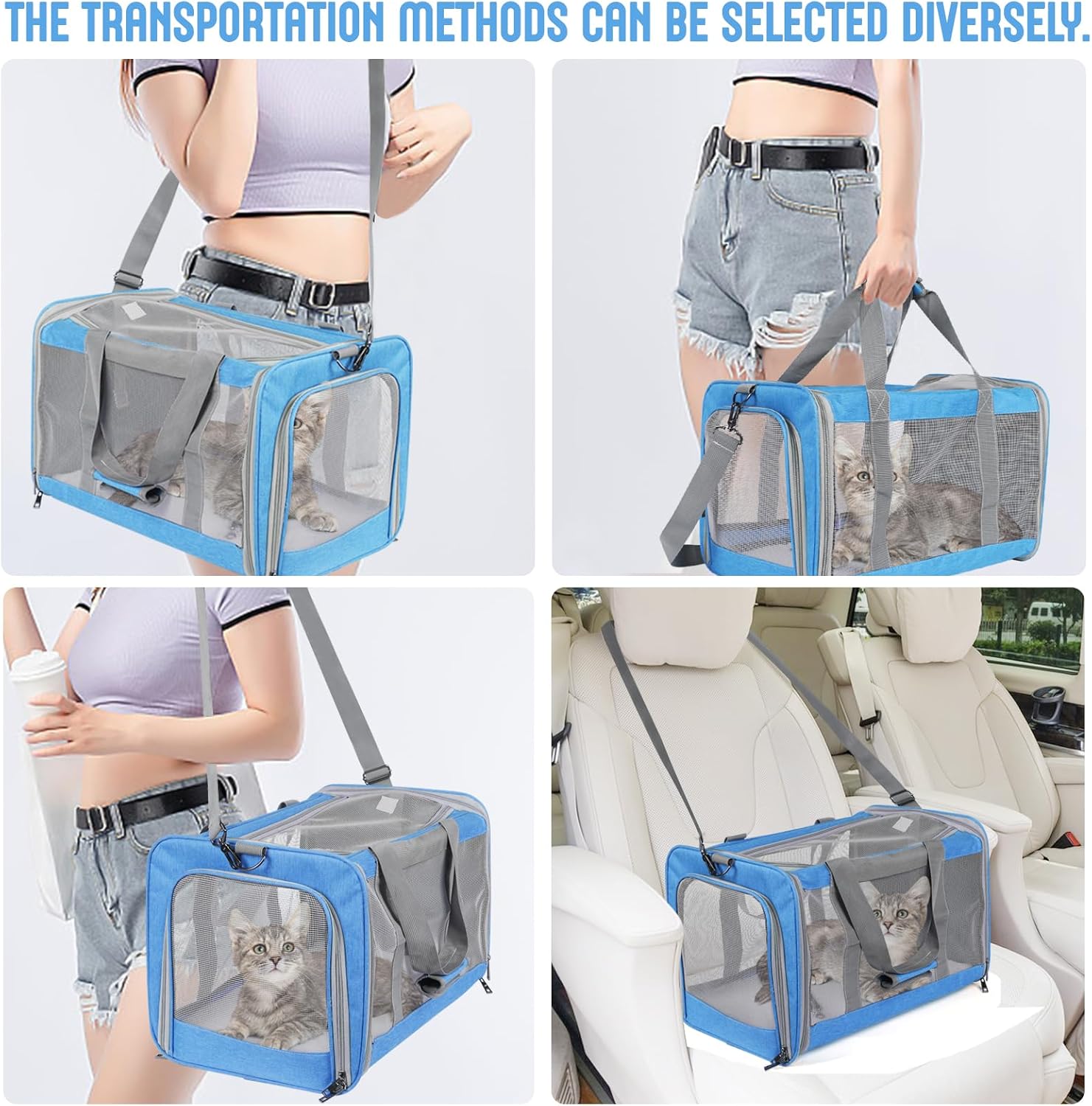 Pet Carrier for Large Cats of 20 Lbs, Collapsible Carrier Bag for Big Cat or 2 Kittens,Soft Sided Puppy Carrier with Sturdy Travel Transport Strap, Adequate Ventilation, 4 Mesh Windows (Blue)