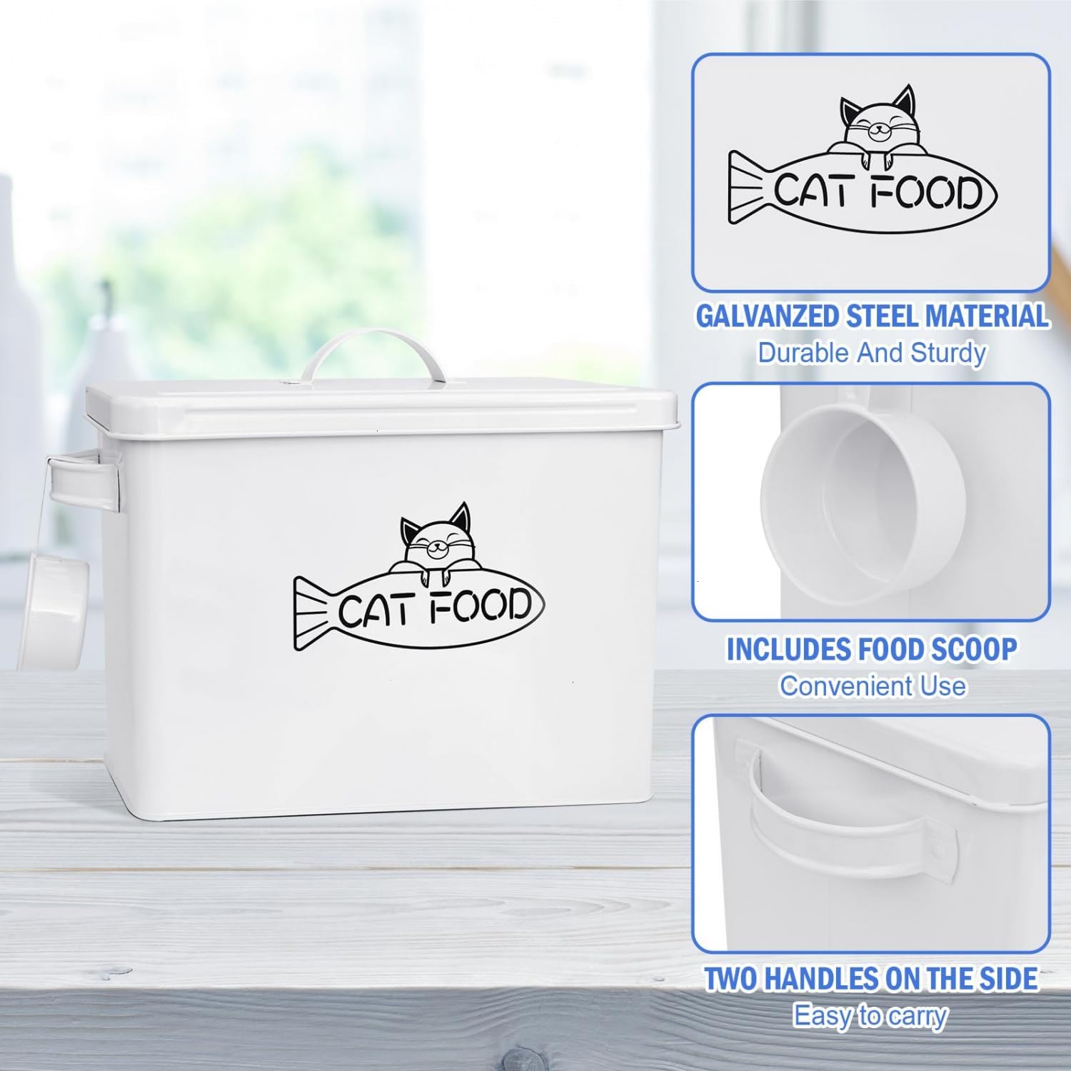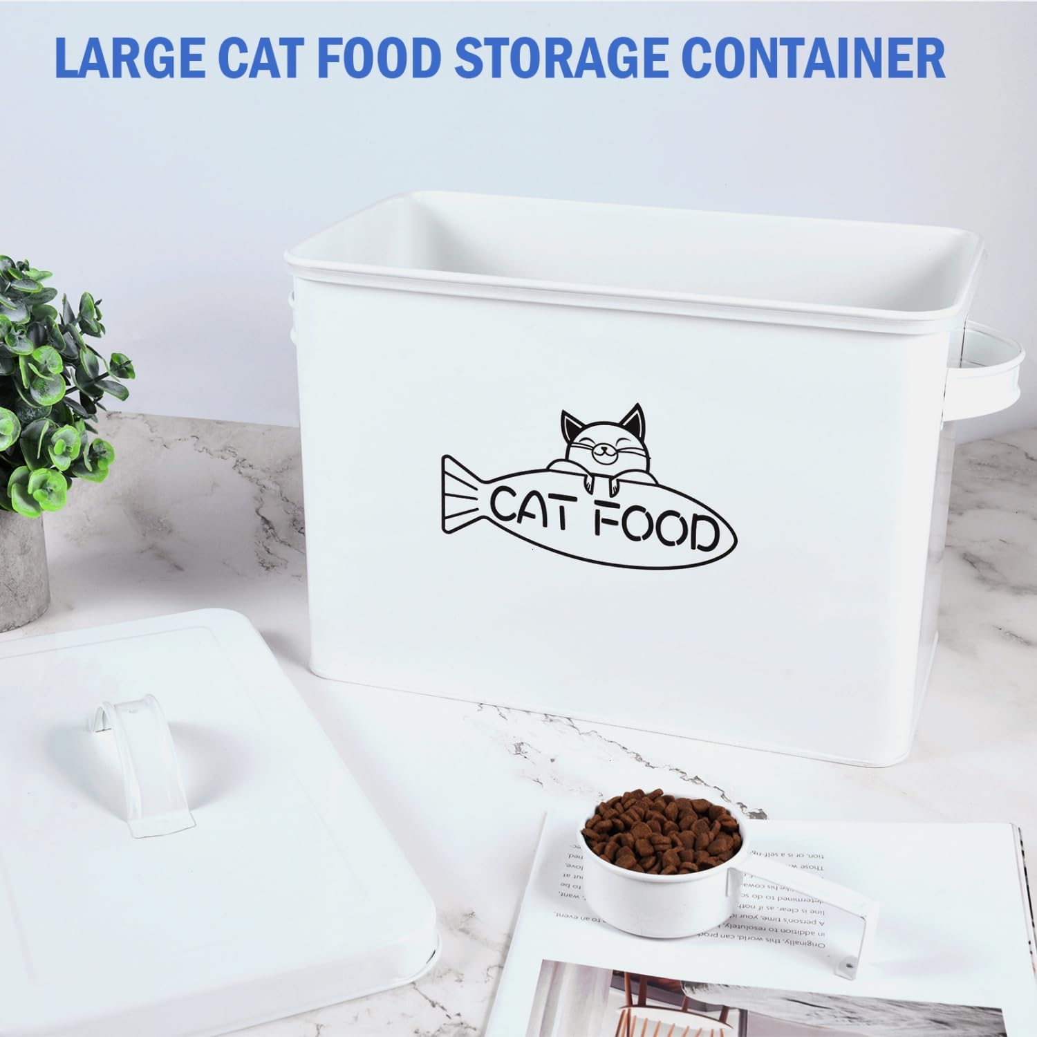 - ✔ EASY TO USE: The cat food storage comes with a sturdy metal scoop that can hang on the side of the storage bin for conveniently transferring the food to dog's or cat's bowl. With metal carrying handles for easy to grasp when using it.