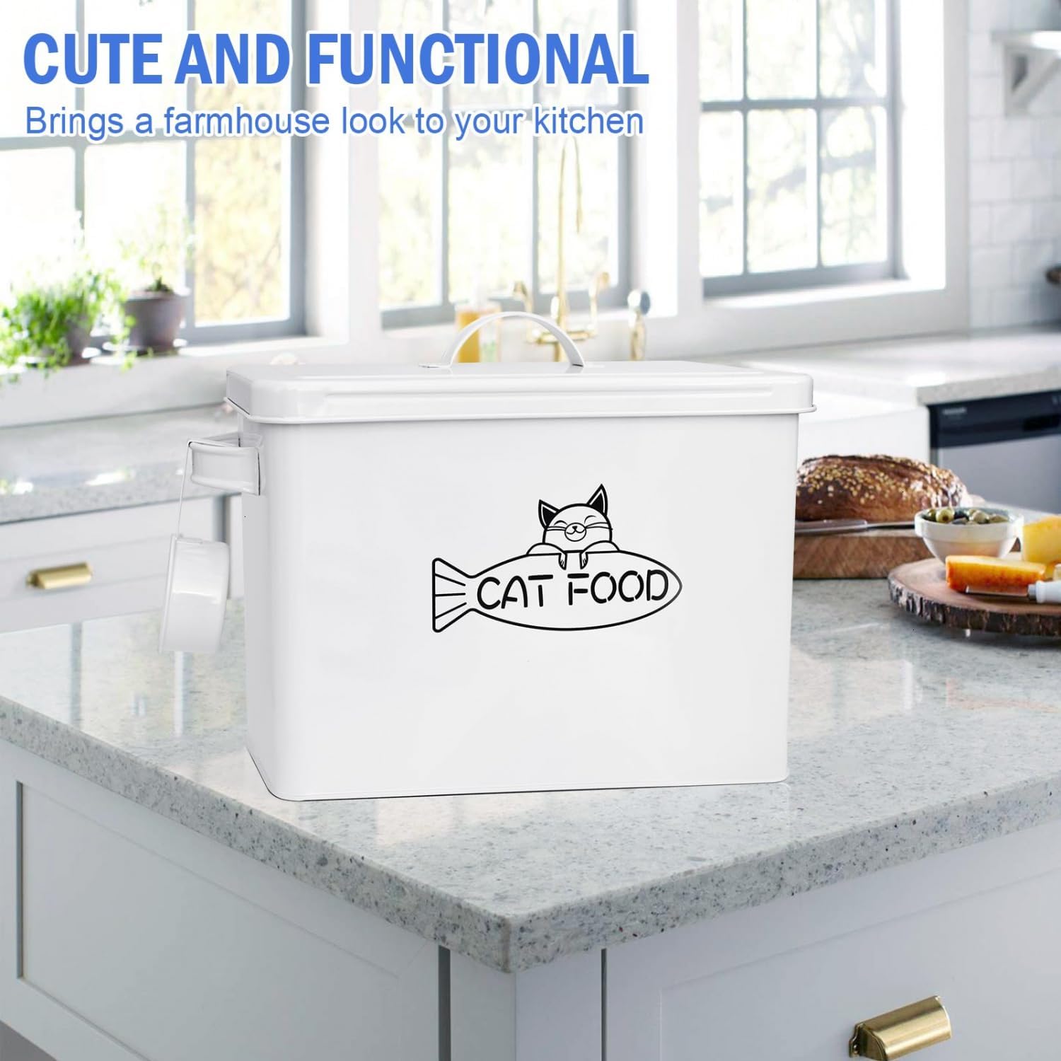 - ✔ PRACTICAL & CUTE: No more dealing with unsightly cat food bags. Whether on display on your countertop, or store in your pantry, the cute cat treat container is an eye-catching focus. Add a touch of farmhouse style for your counter.