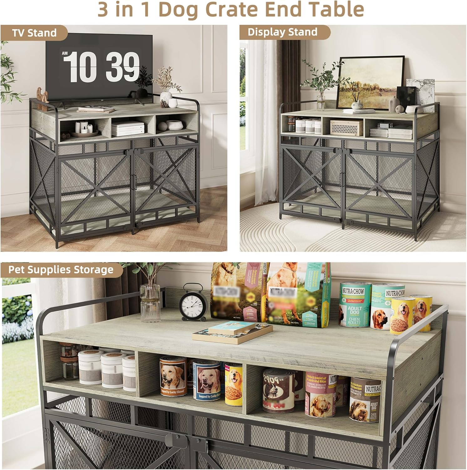 Dog Crate Furniture, 43" Heavy Duty Wooden Dog Crate End Table, XL Dog Kennel Furniture Large Breed, Decorative Dog Kennel Indoor with 3 Drawers & Steel Tubes 43" L x28 W x36 H (Grey)