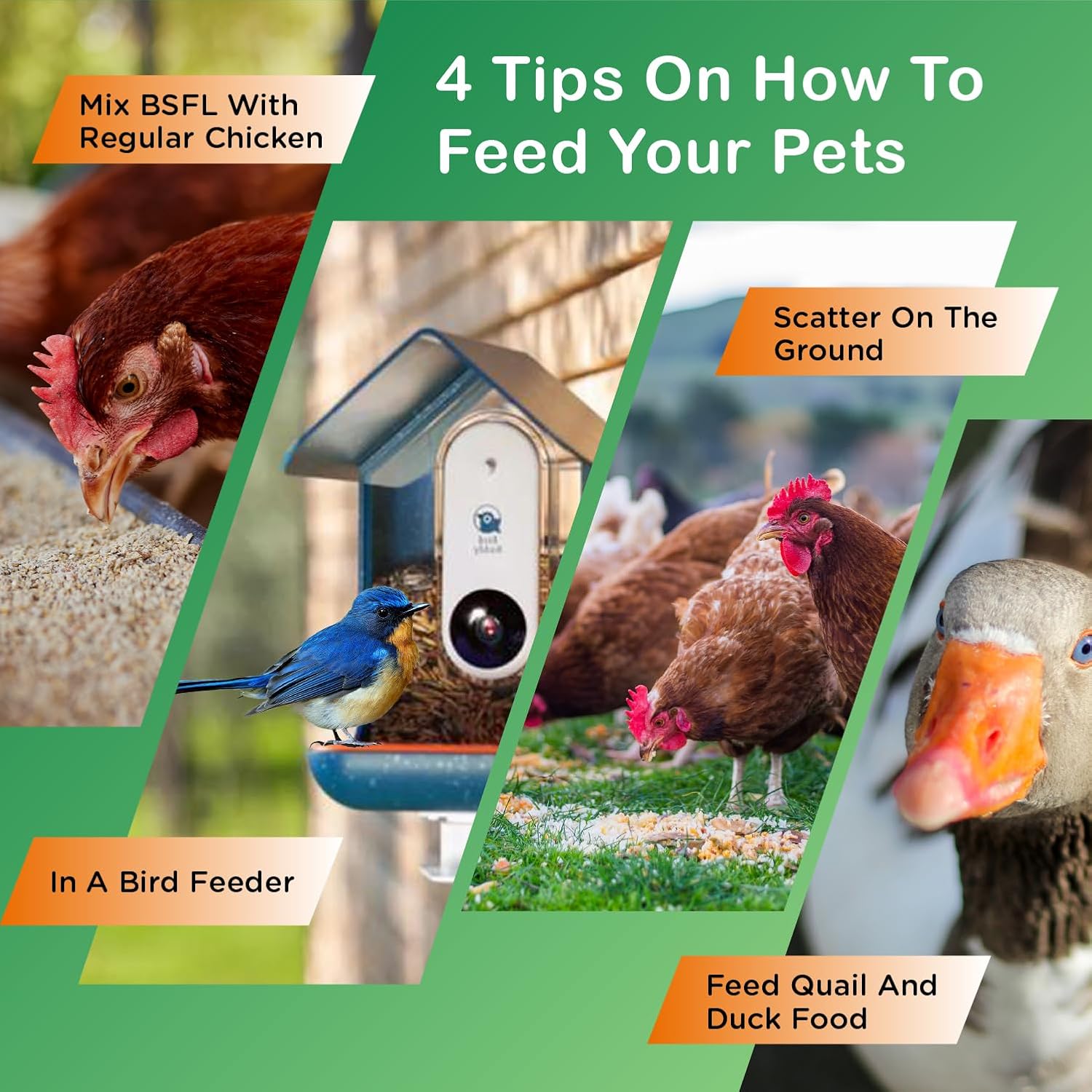 - Sustainable – Our BSF larvae are raised on organic feed made from bran, flour, and surplus fruits and vegetables. This makes them a 100% natural, sustainable food source for chickens, wild birds, fish, reptiles, and more
