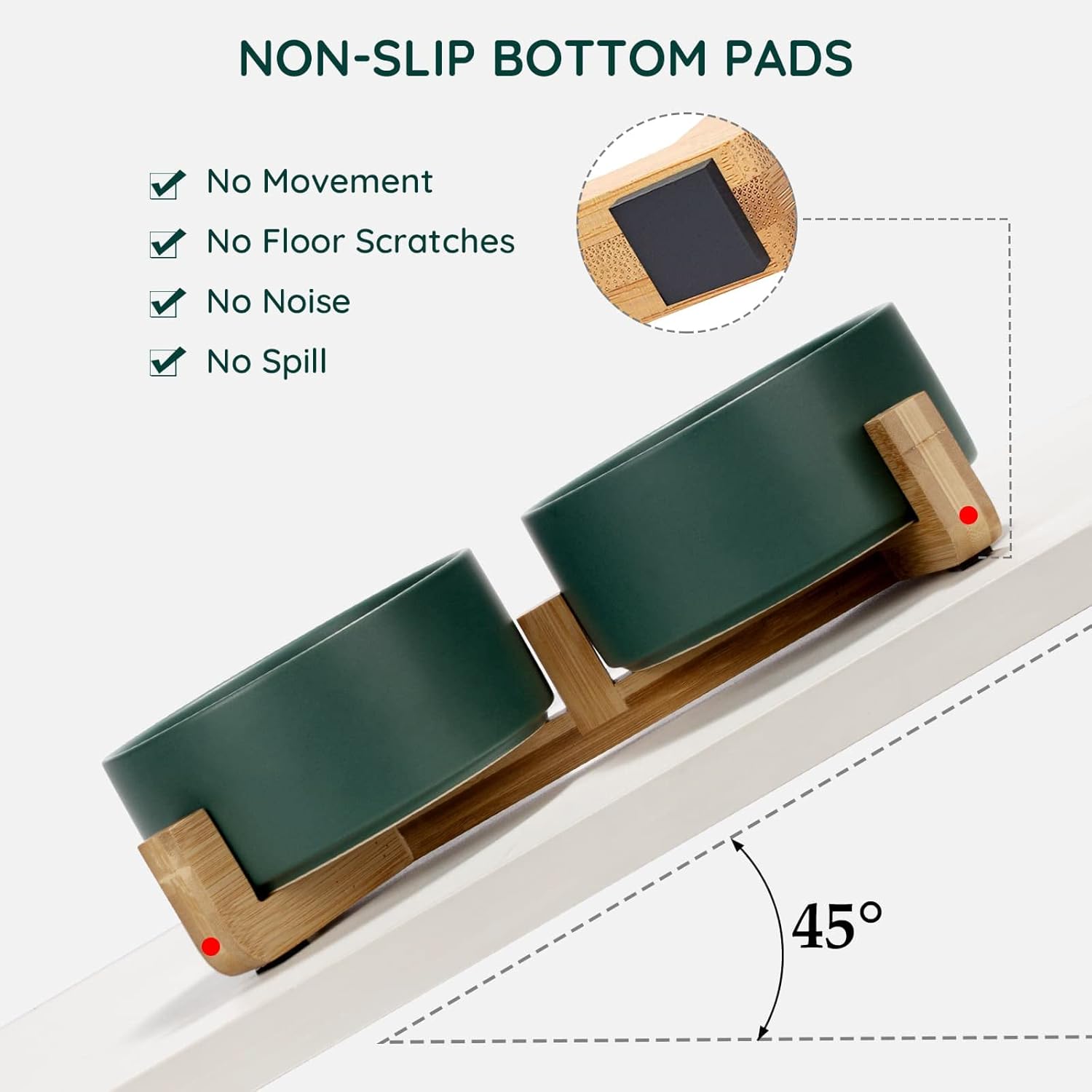 SPUNKYJUNKY Ceramic Dog and Cat Bowl Set with Wooden Stand, Modern Cute Weighted Food Water Set for Large Size Dogs (7.6 Cups, 2 × Green)