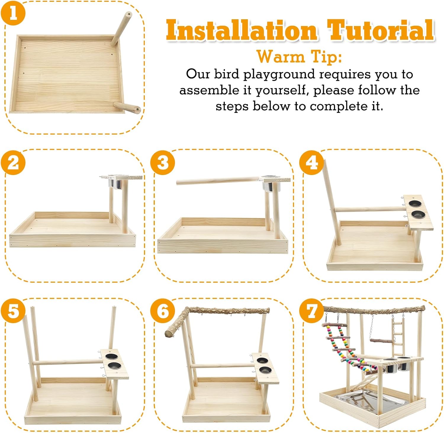 - HAVE A FUN BIRD PLAY GROUND: Wooden Parrot Playstand Stand Package includes all the parts of bird stand,including screws, a tray, toy, water cups. Besides, we put a little screwdriver in the package for assembling it. You can refer to this data before you buy it to see if it is suitable for your birds. PLZ NOTE the size dimension, if your birds are too big, please choose our other larger wooden stand
