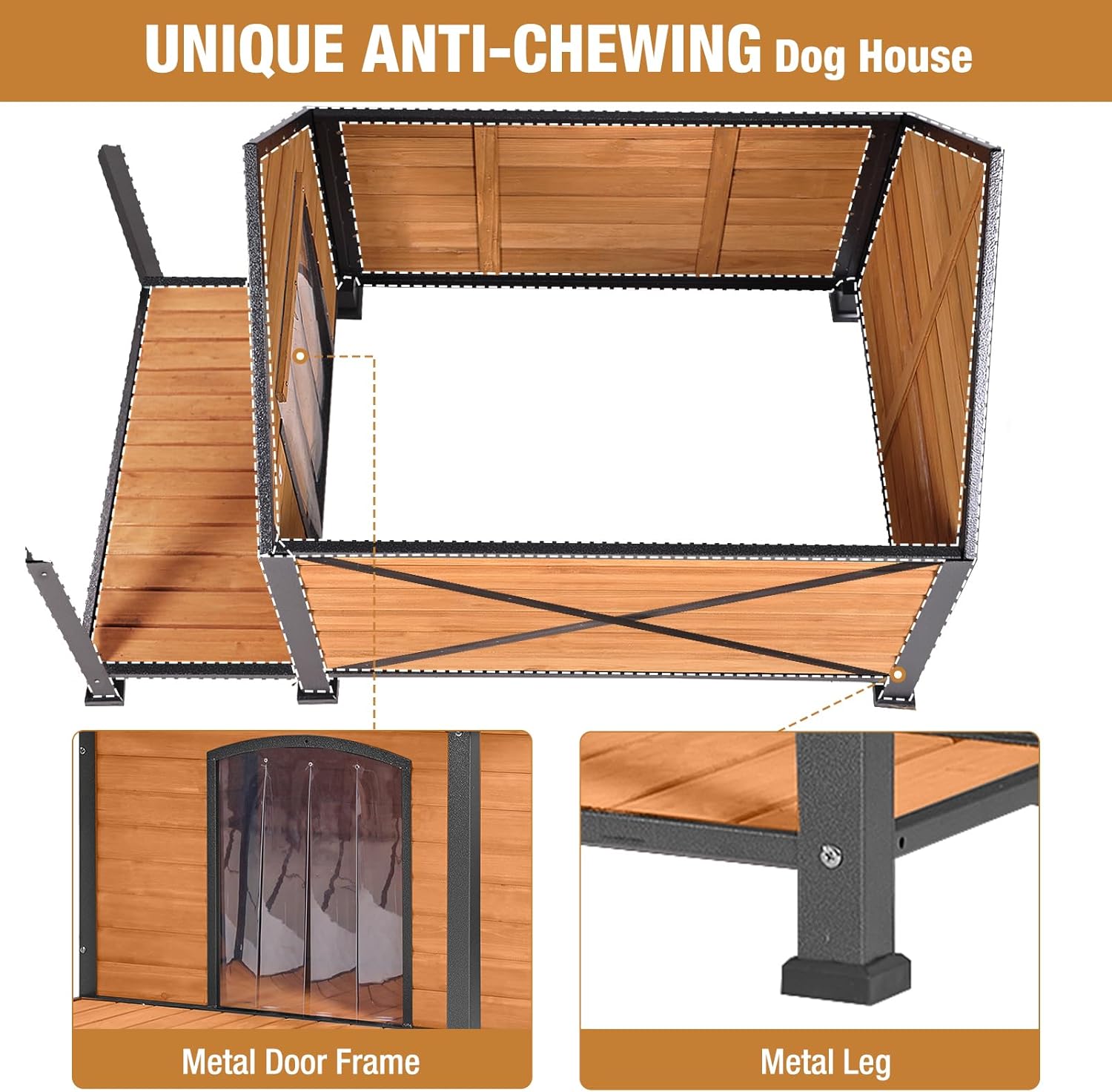 - 【Strong & Durable】Our dog house Combine with solid wood and UNIQUE all-around stronger iron frame, prevent destruction and chewing from animals. Anti a 180-pounds adult can easily sit on the platform.
