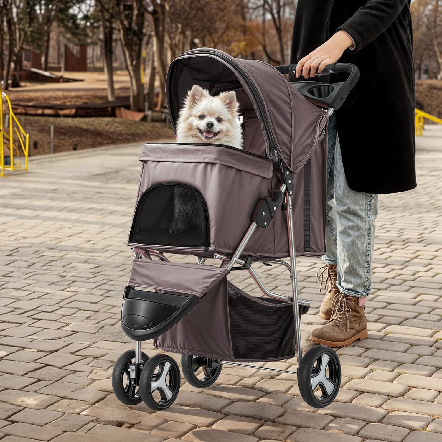 - Humanized Design - With convenient features like swivel front wheels, cup holders, and a hooded peak-top window, this pet stroller makes taking your pet out for exercise and fresh air an easy and enjoyable experience. The roomy design and undercarriage storage basket give you plenty of space to carry your essentials, too.