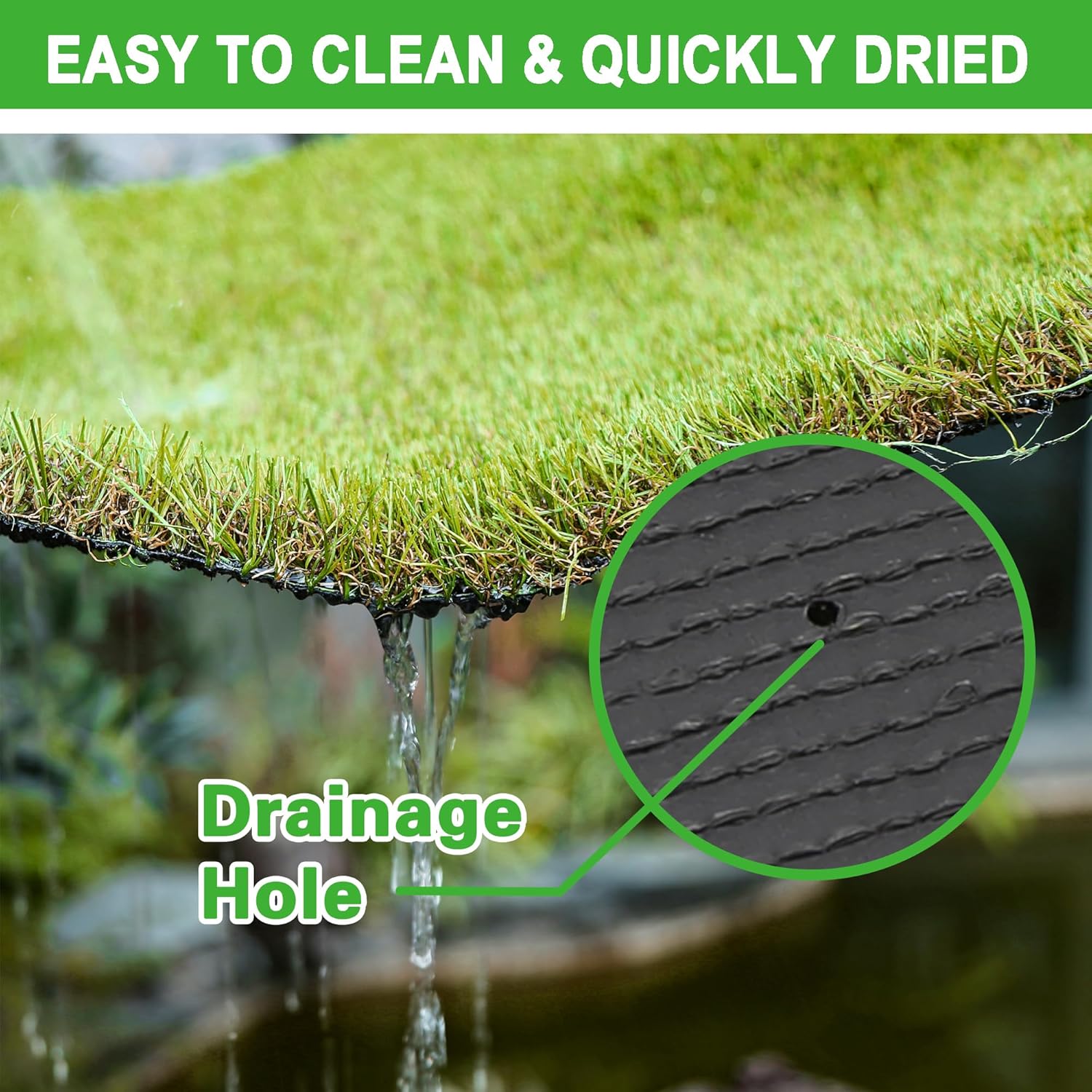 - Easy to clean:Constructed with a highly-drainable backing material to maximize draining capacity, with drainage holes to help urine and clear water wee away quickly,Just rinse with soapy water and dry on the balcony. Cleaning our pet bedpan artificial turf pads is quick and easy.