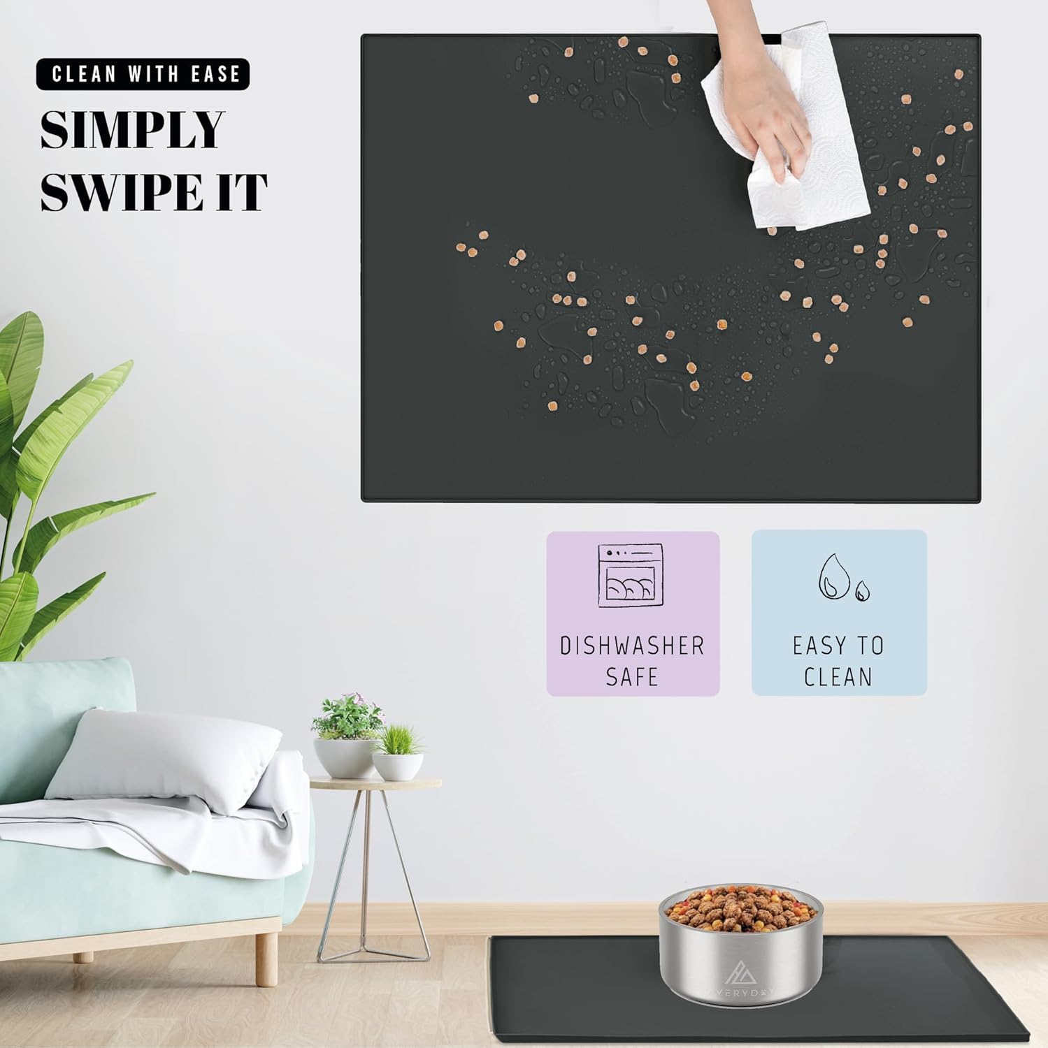- Non-Slip Design: No more sliding bowls! AVERYDAY's heavy-duty pet mat stop bowls from sliding during meals. The dotted surface boosts slip resistance, ensuring your pets' food and water bowls stay securely in place