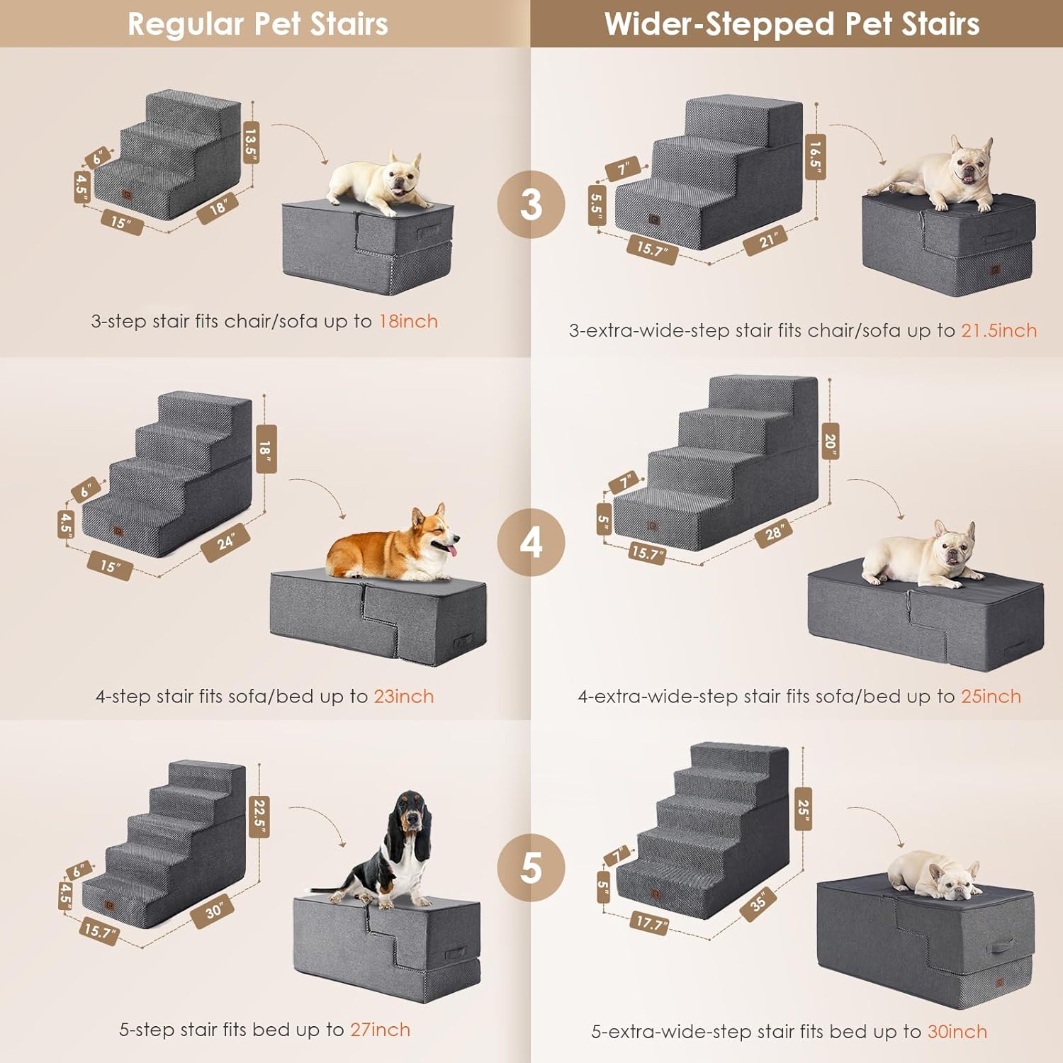 - MULTIPLE STEP SIZES - This dog stair comes in 3, 4, and 5-step options. Our 3-step pet stair is ideal for sofas and low beds (up to 18 inches high), while the 5-step version is better suited for higher beds (up to 27 inches). If your bed is of medium height (up to 23 inches), please select the 4-step one.