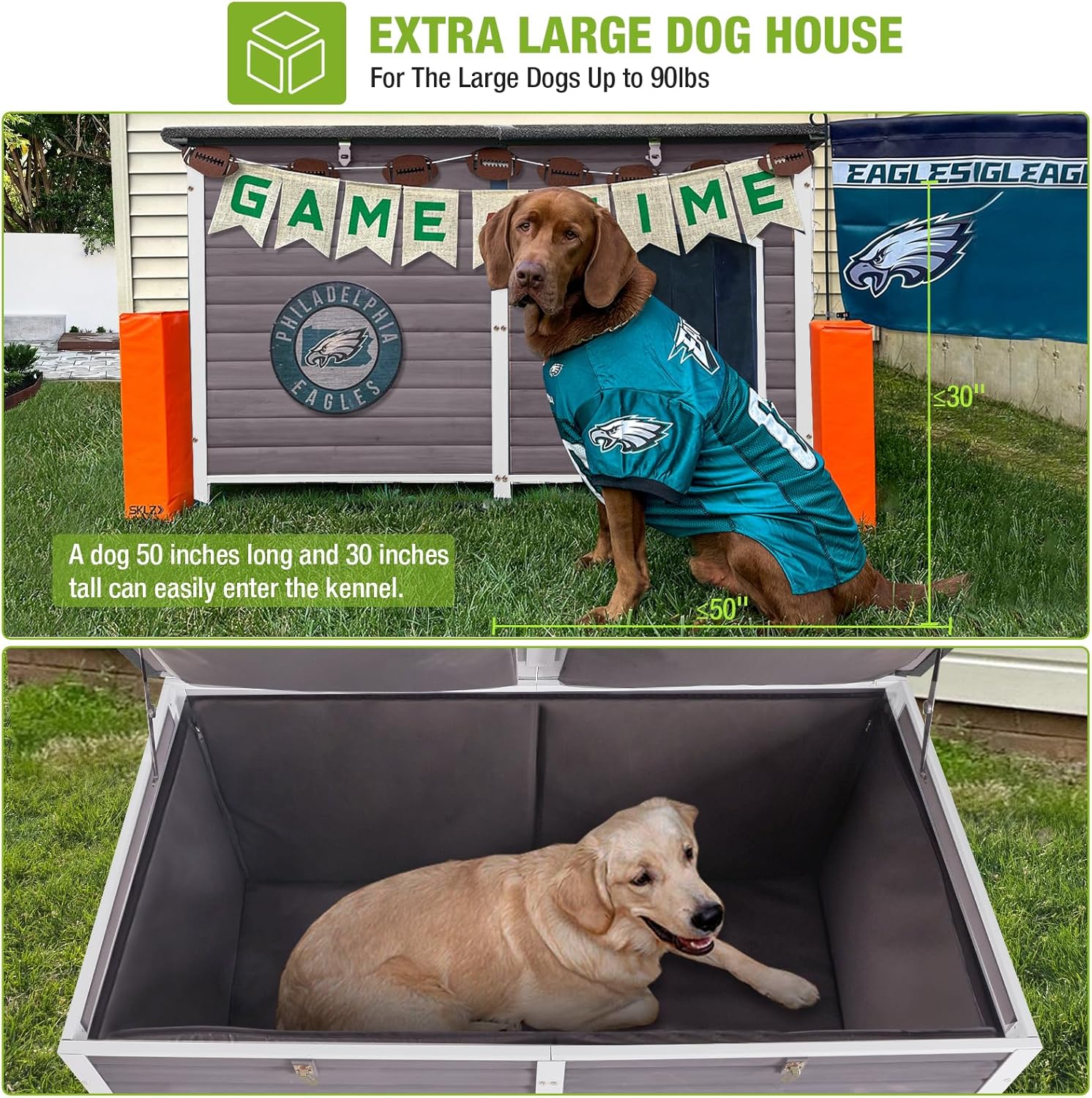 - Weather Resistant -Large wooden dog house is designe to withstand the elements. Waterproof asphalt roof ,PVC strip and plastic feet offers superior protection against rain, snow, and harsh sunlight.