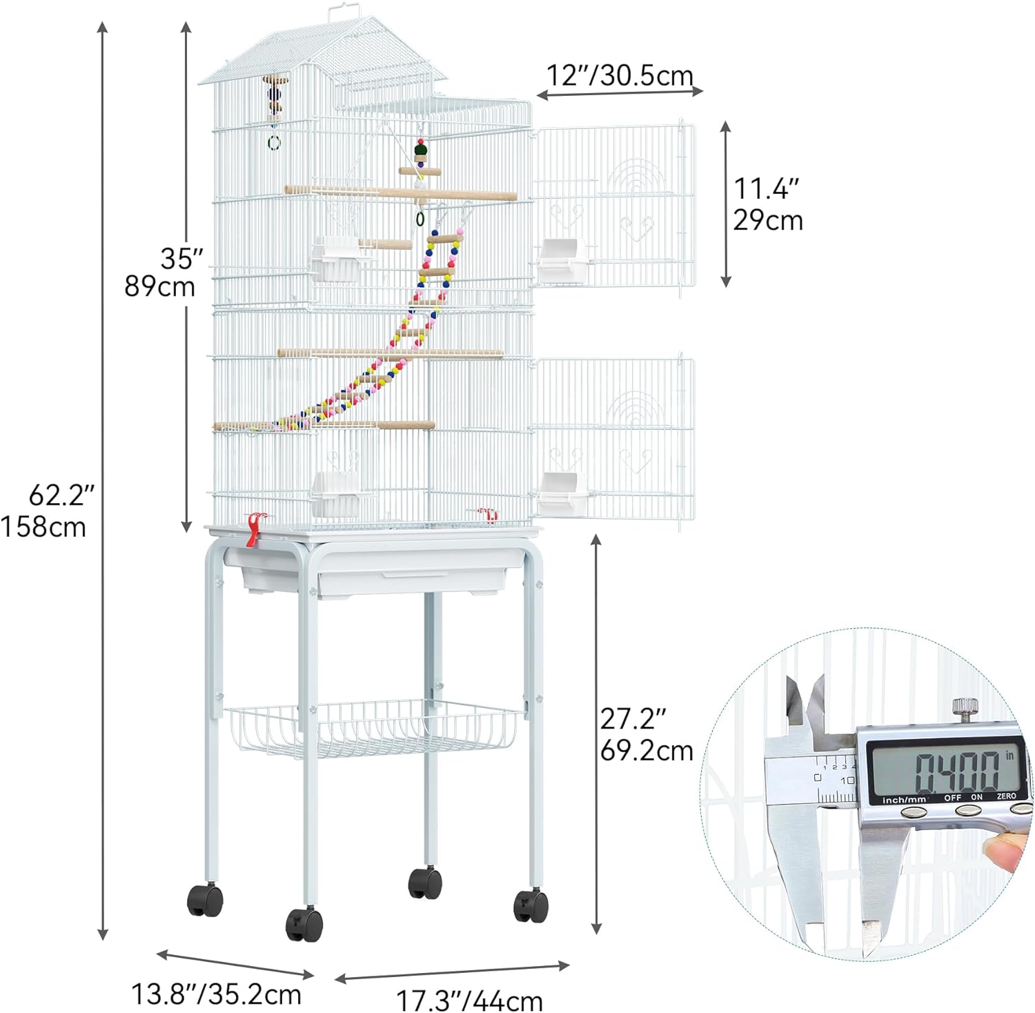 YITAHOME 62 inch Metal Bird Cage, Large Parakeet Cages for Parrot, Cockatiel, Lovebird, Pigeon with Roof Top, Rolling Stand and Hanging Accessories, White