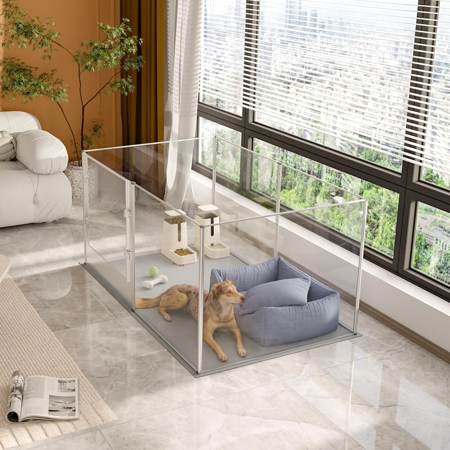 - Clear Acrylic Fence Design - Crystal-clear acrylic dog fence playpen enables you can interact with your pets closely, 360° high transparency and wide vision, it’ll relieve your pets from anxiety, they also make sure you are by their side, equipped with a door for dog mom/ pets to come and go easily, so this is a unique gift for your loved friends, get this fence in the room, instantly improve the overall interiors