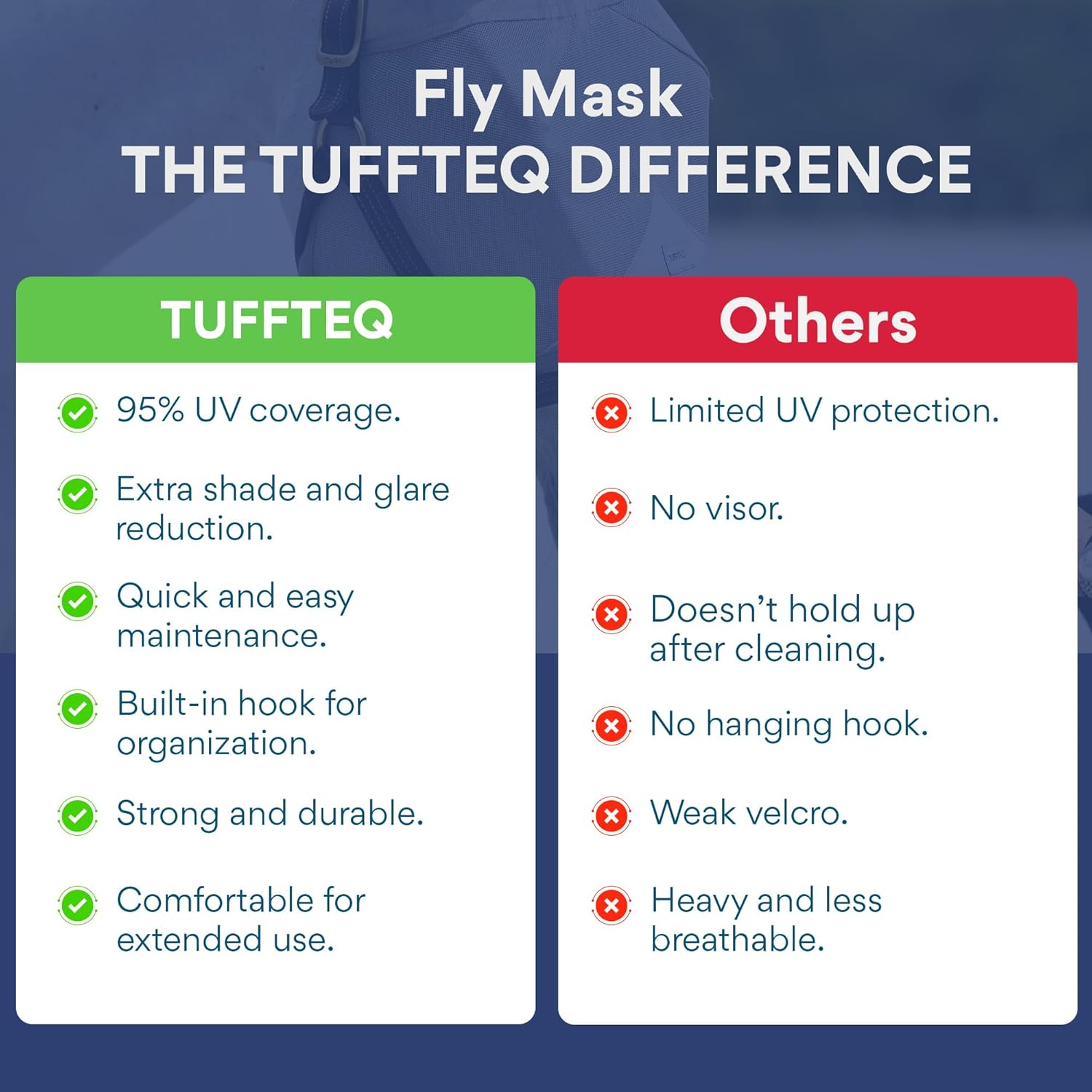 - CONVENIENT HANGING HOOK: Equipped with a built-in hook, these UV fly mask for horses are easy to hang on barn doors, keeping your stable's horse care, horse supplies, horse grooming supplies and equestrian equipment organized.