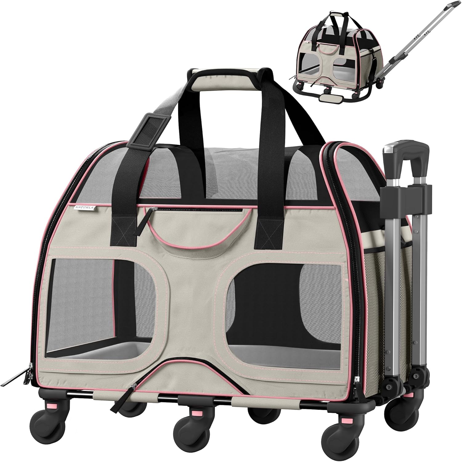 Katziela Pet Carrier - Airline Compliant Dog Carrier - TSA Approved Pet Carrier for Small Dogs and Cats - Soft FAA Travel Airplane Dog Carrier Luggage (Gray/Pink-6 Wheels)