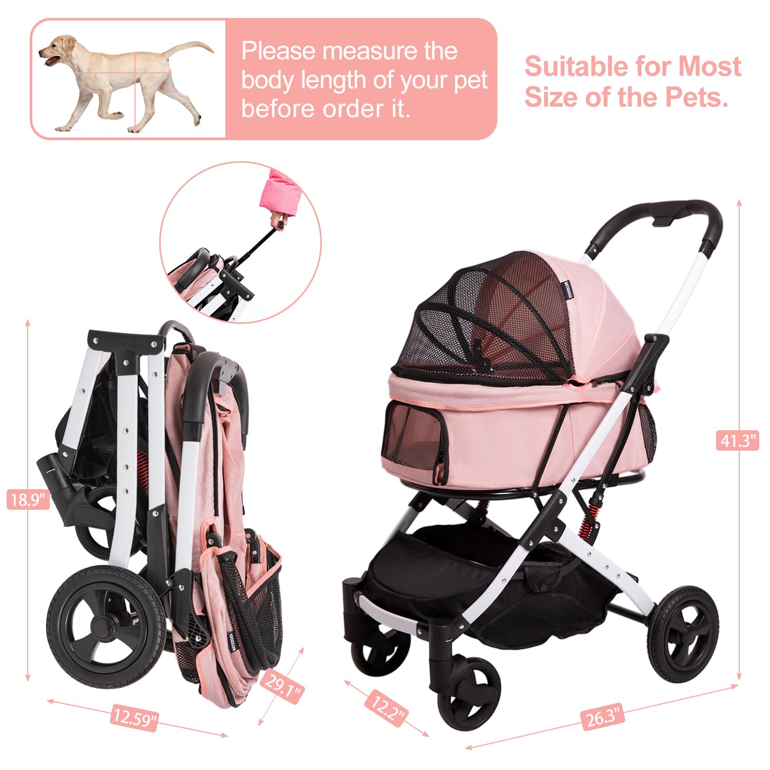 Pet Stroller for Medium Small Dog & Cat, Foldable Lightweight Dog Stroller with Storage Basket Pet Travel Carriage with Safety Leashes, 4 Wheel, Pink