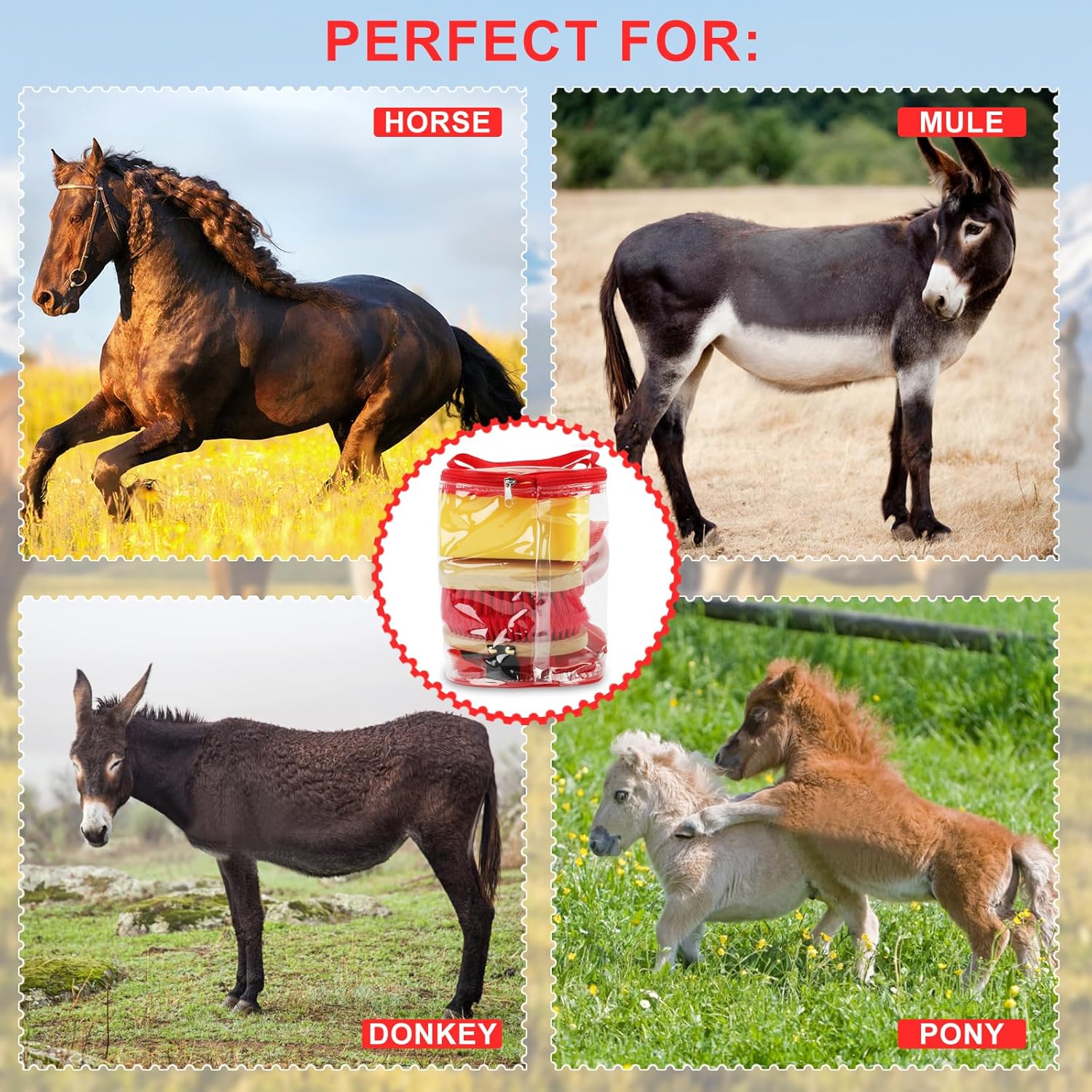 - 9 Pieces package contains:The horse grooming supplies, includes a horse grooming tote bag, a oval massage curry, a hard brush, a soft brush, a sweat scraper, bathing sponge, a hoof pick , a mane comb and a tail comb