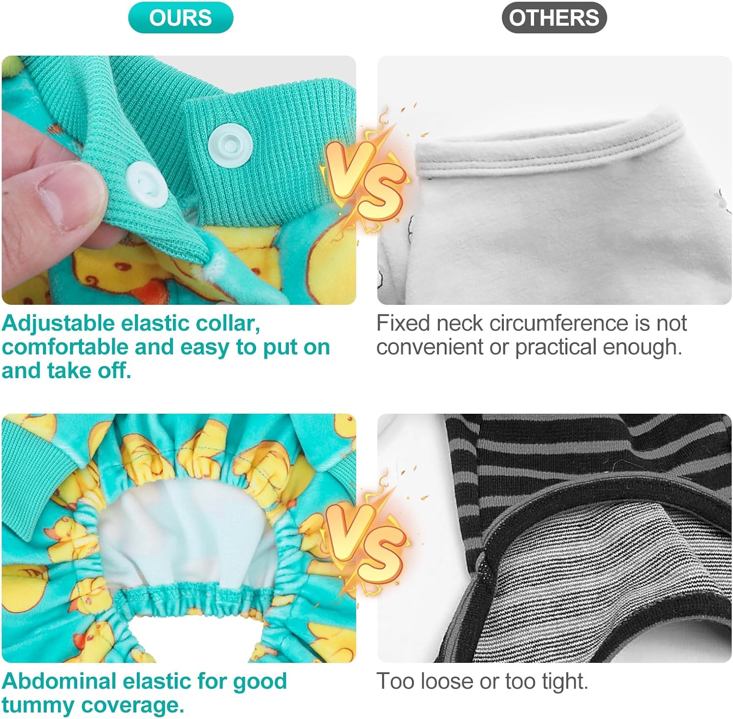 - Easy to Put on and Take off: Our dog pjs are delicately designed with convenient wearing and removal methods. The elastic collar and hidden buttons make it easy for you to quickly put on or take off the pet onesies for your pet.