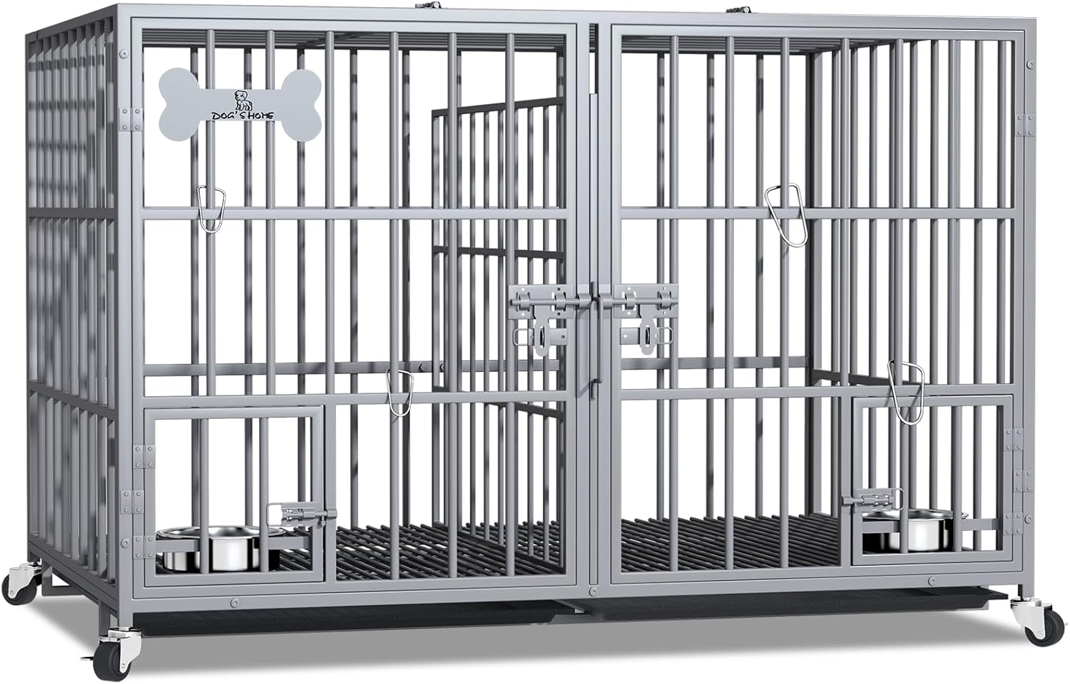 aboxoo 42/48 inch Heavy Duty Metal Dog Crate for 2 Dogs/Large Dog,All Metal Open Top,Dog Kennel Indoor with Wheels,Floor Grid, Tray, Divider and Feeding Bowl (Sliver)