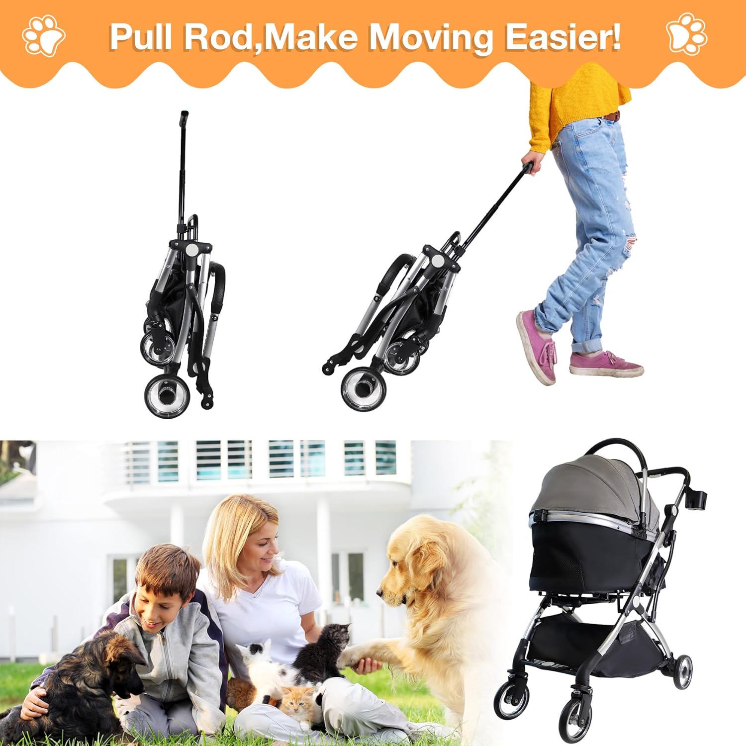 Dog Stroller for Small Medium Dogs, 3 in 1 Folding Pet Stroller Up to 33 lbs, 4 Wheels Pet Strolling Cart with Zipperless Entry, Cat Dog Travel Carrier with Telescopic Handle and Storage Basket