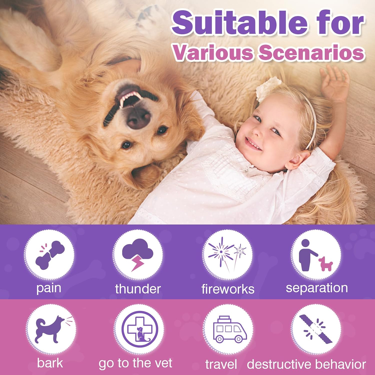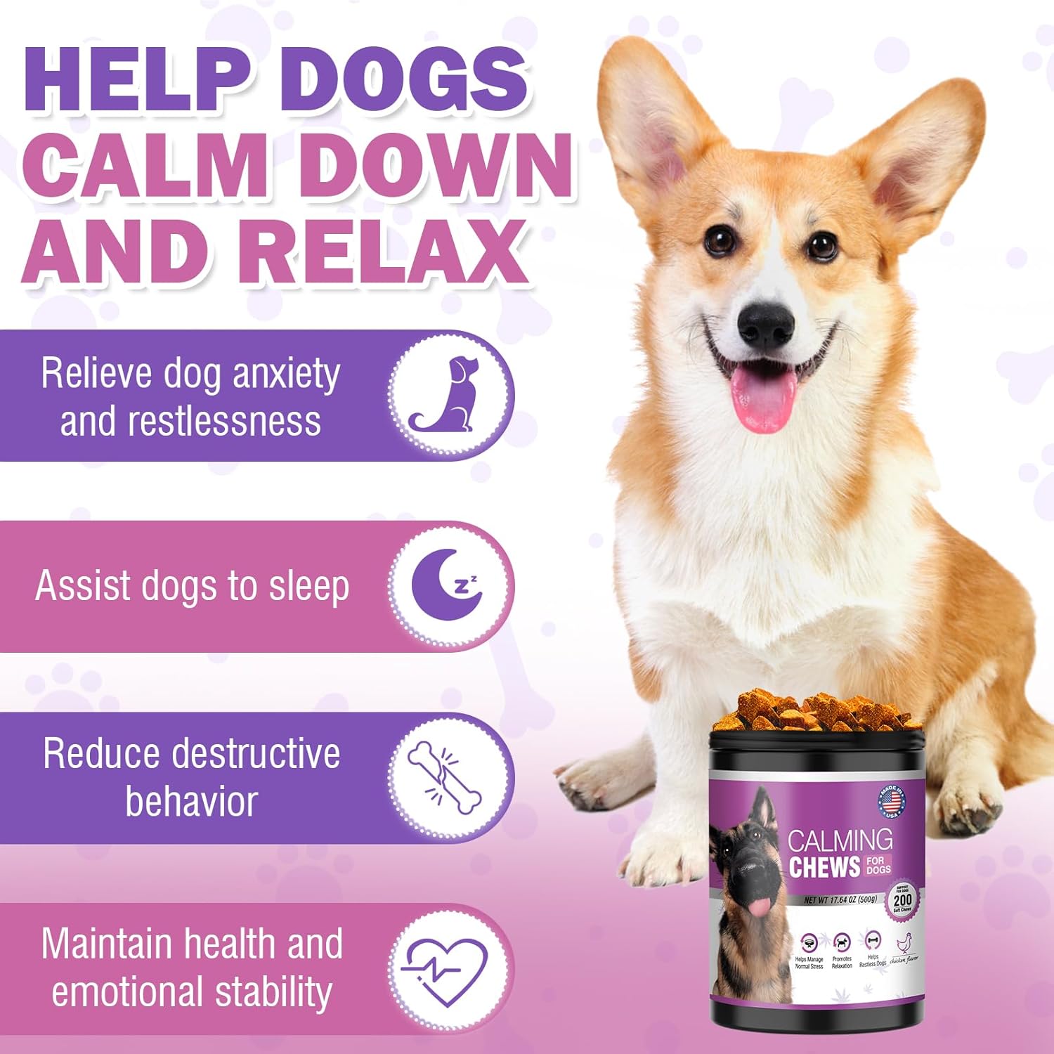 - [Promotes Dog Calm and Anxiety Relief for Dogs] Calming chews for dogs effectively soothe and reduce dog anxiety, and dog calming treat provide a sense of calmness for dog. Ideal for various situations such as thunderstorms, separations, car rides, and veterinary visits, dog calming chews help relief anxiety for dogs and find peace of mind. Dog calming treats are specifically formulated to aid in reducing anxiety and promoting better sleep in dogs. Hemp chews for dogs provide dog hours of calm