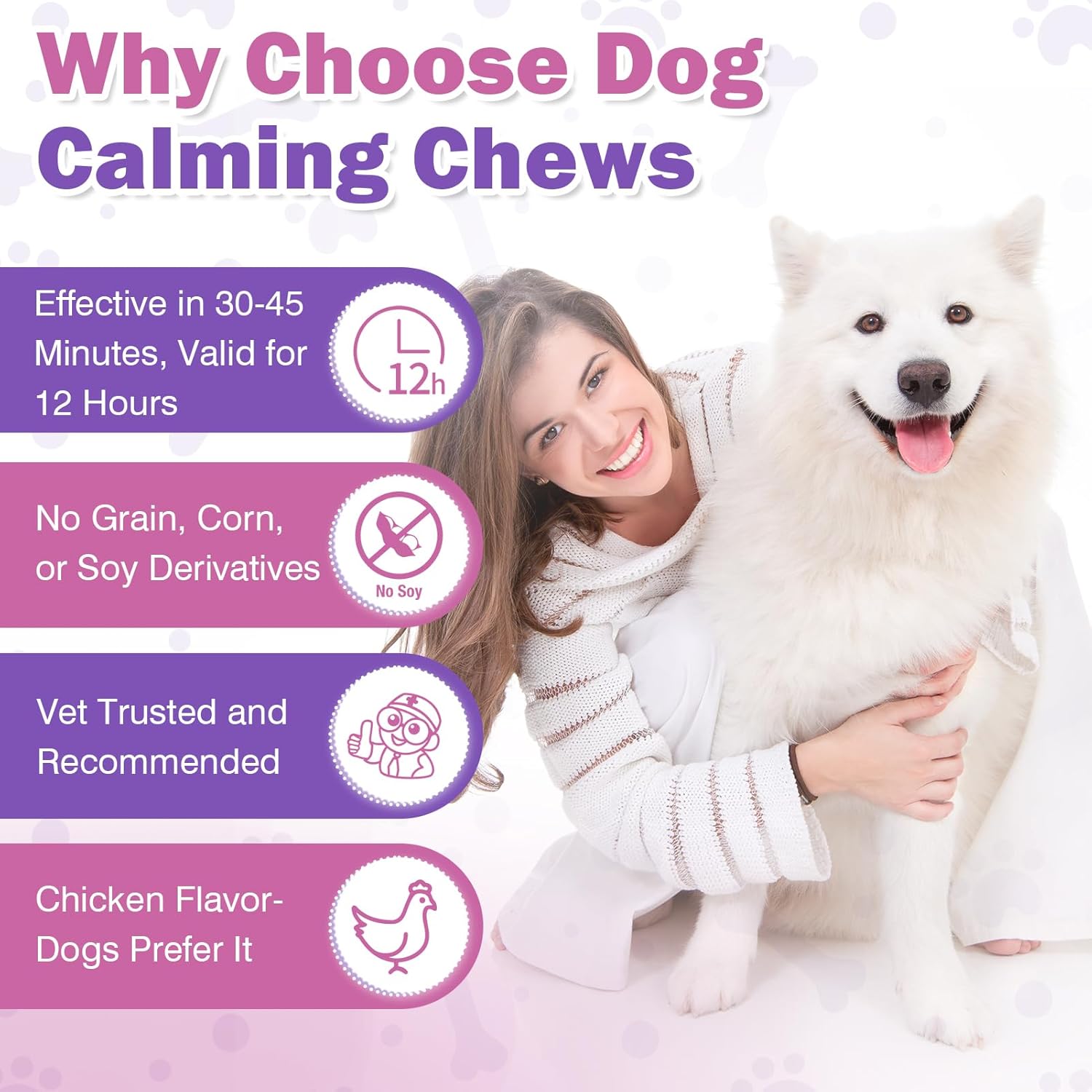 - [Fast and Effective Dog Hemp Calming Chews] calming chews dog work fast, typically within 30-45 minutes, offering up to 12 hours of anxiety relief for dogs. Perfect for situations where dog needs to be calmed quickly, calming chews dogs are effective in helping dog cope with anxiety, fear, or irritability due to various stressors. With dogs calming treats, dog will no longer be scared or irritable due to various troubles. Use dog calming treats for anxiety before a trip to help dog calm quickly