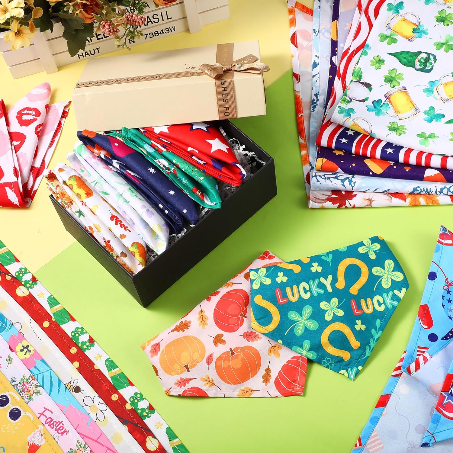 - Dazzling Flexibility: dress your pet for any season with these bright colored and stunning holiday dog bandanas; Each package comes with 72 different patterns representing various holidays across seasons, spring, summer, autumn, winter, and renowned festivals; Whether it's Valentine's Day, Independence Day, or Christmas, your dog will be all set to steal the show