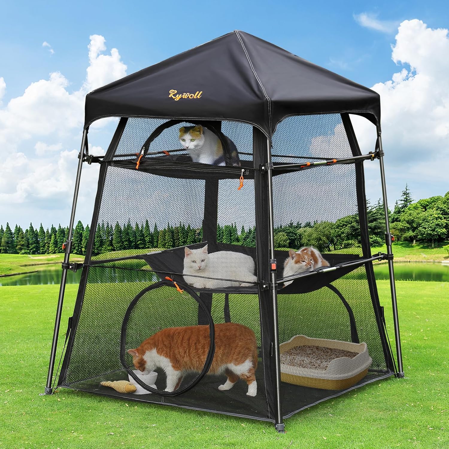 - 😽【More interactive windows for convenience】This premium catio cat enclosure contains a fully enclosed indoor space with 5openings and 3levels for cats to snooze and relax. A zip door on the side makes it easy to reach in, whether its meal time or time for some cuddling. The large bottom window makes it easy for the owner to crawl inside to clean and replace cat litter. Rywell cat enclosures can easily be connected with other playsets via tunnels, Free to customize your feline's playground!