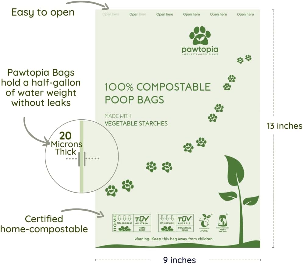 - Purely compostable dog poop bag (120 bags, Pink dispenser pouch): Pawtria - Pawtopia supports sustainable living and does not harm the environment (unlike plastic bags). Our biodegradable dog poop bags, made with vegetable starches (corn starch), are 100% home compostable and break down into natural substances such as water, Co2, and biomass. Our biodegradable poop bags are certified with OK Compost Industrial under EN 13432 (equivalent to ASTM6400), and OK Compost Home by Tüv Austria under AS5810/ NF T51800.