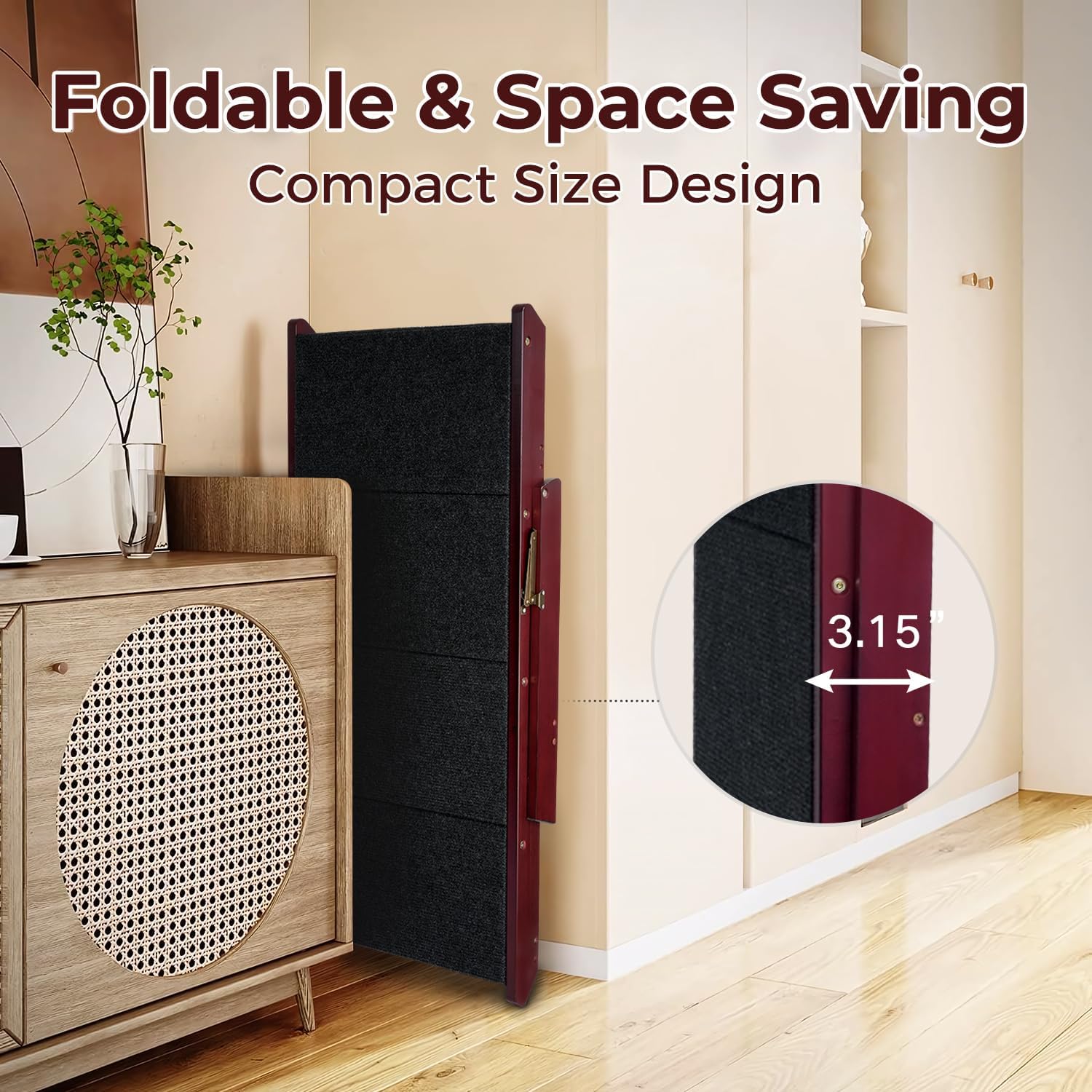 - Space-Saving Foldable Dog Stairs: Our foldable pet stairs feature a space-saving design, folding down to just 3.15" thick for convenient storage. Perfect for narrow spaces like under beds or in car trunks, it's an ideal choice for both home and on-the-go use, offering accessibility wherever your pet needs it