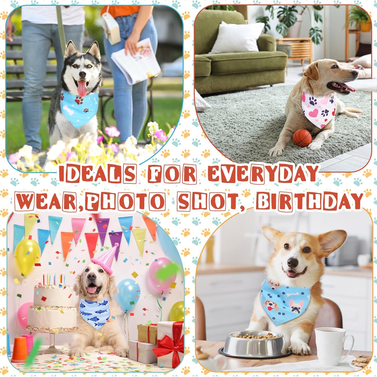 - Ample Quantity: you will receive 72 packs paw bone dog bandanas in 36 styles, 2 of each style, which can make your dog look fashionable, printed with different patterns, bright colors, sufficient quantity, and diverse styles, meeting the different wearing needs of your pet and daily replacement use