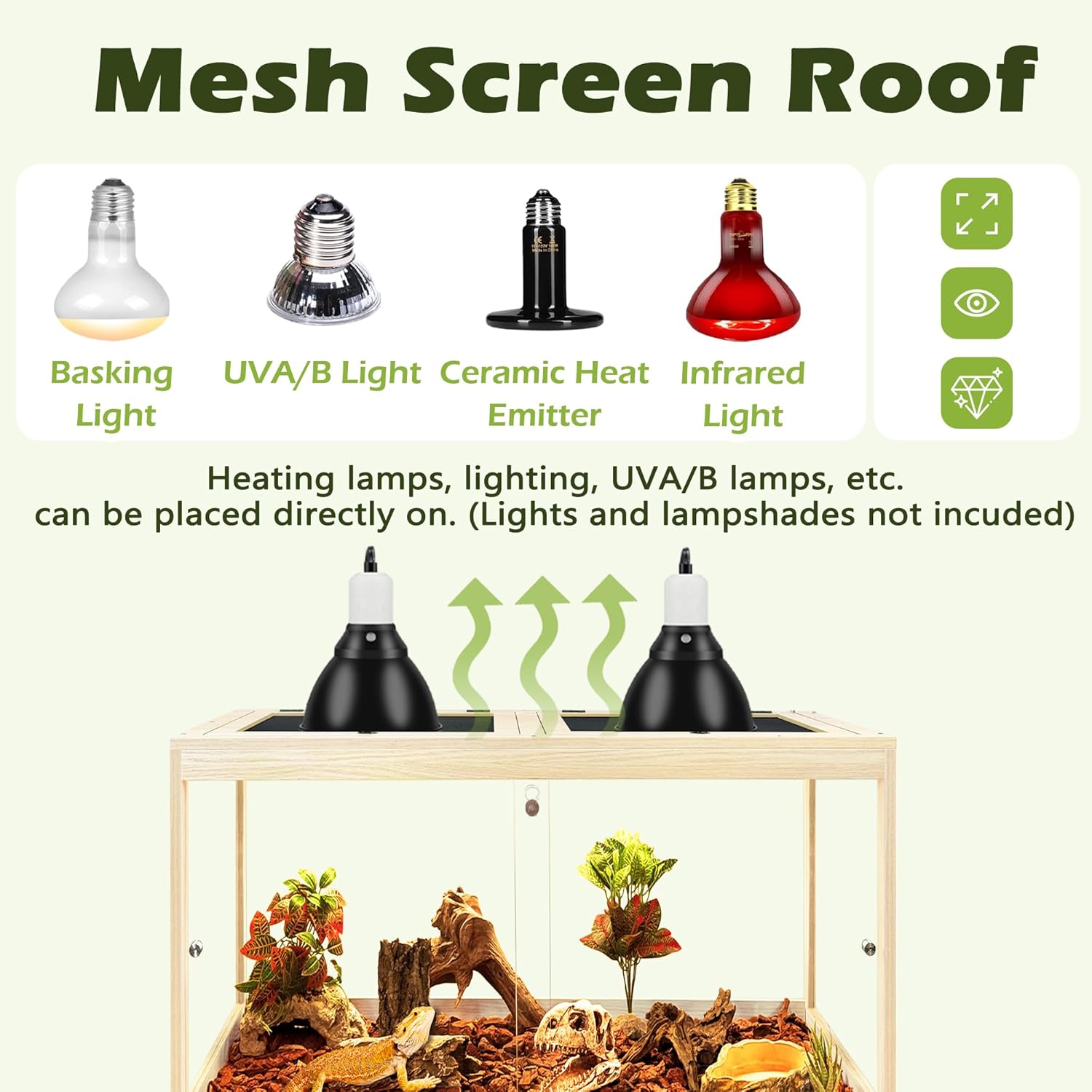 - 【Smart Design for Comfort & Security】The front features double sliding glass doors with a secure lock for easy access and peace of mind. A sturdy metal mesh top ensures proper ventilation and is compatible with heat lamps or UVA/UVB lighting setups (not included), helping maintain the perfect conditions for your reptiles.