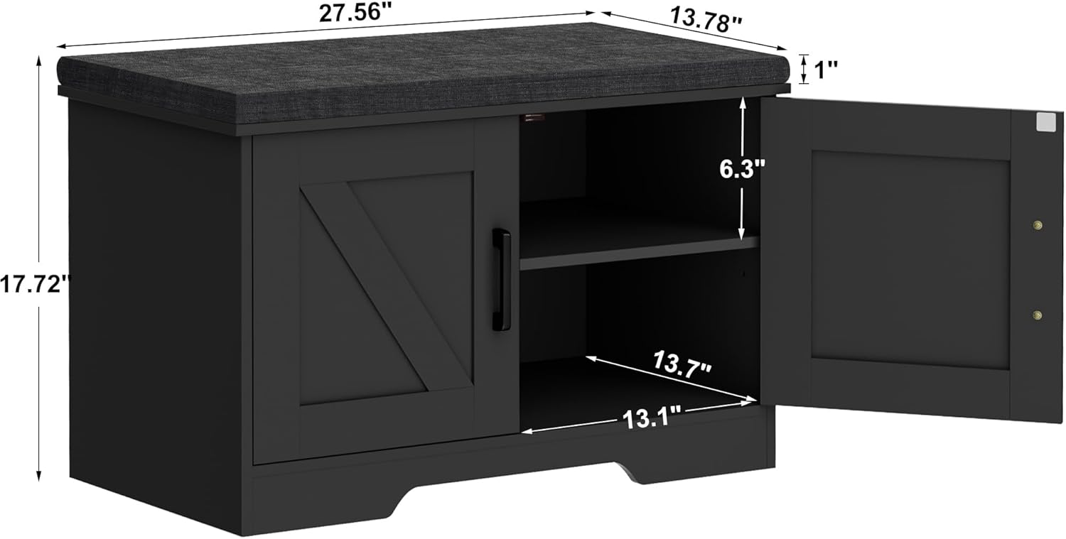 2-Tier Storage Bench, Shoe Bench with Padded Seat Cushion, Entryway Bench with 2 Barn Doors, Adjustable Shelf, 13.8" D x 27.6" W x 17.7" H, for Entryway, Living Room, Bedroom, Black