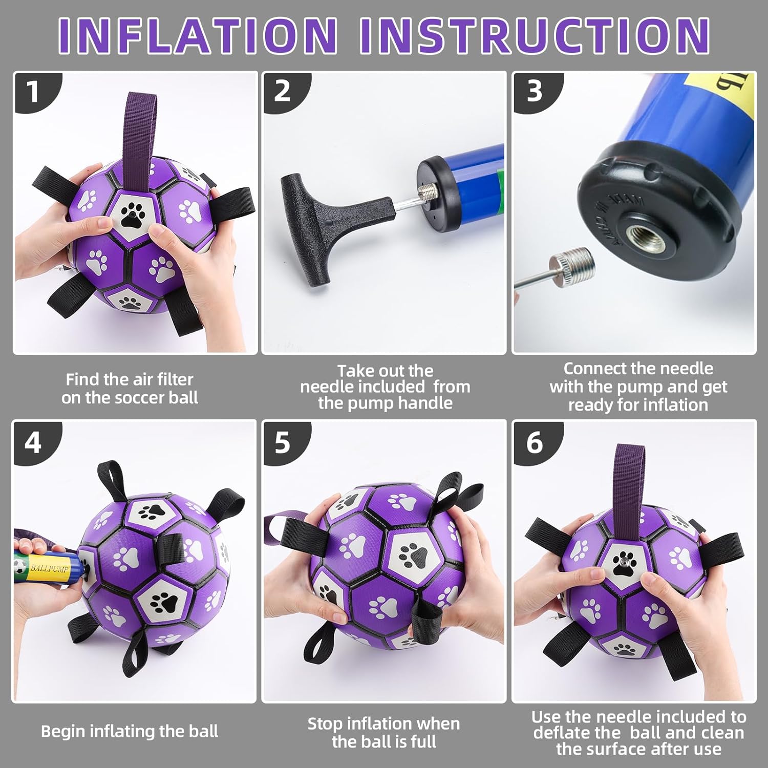 - ⚽Pump & Needle Adapter Included: The herding balls for dogs come deflated. There's a needle point adapter and a pump inside as well while other items in the same market only include a ball needle. The soccer ball dog toy is 8 inches in diameter, perfect for large breeds, not for aggressive chewers.