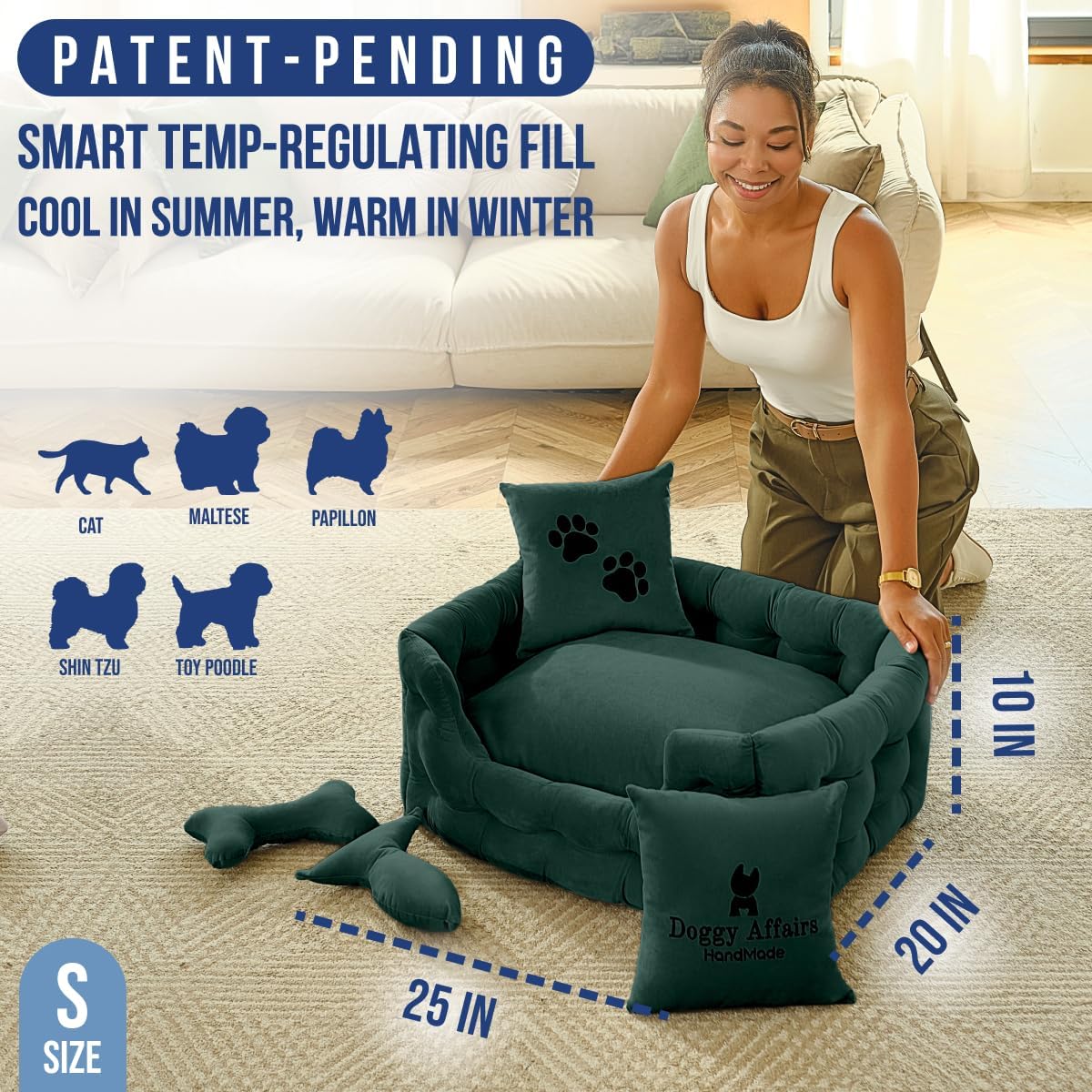 - JOINT SUPPORT COMFORT & TEMP REGULATION: Premium cushioning supports joints, hips, and growing bones, while smart fill keeps her cool in summer and warm in winter. The only calming dog bed that truly hugs her back like your arms.