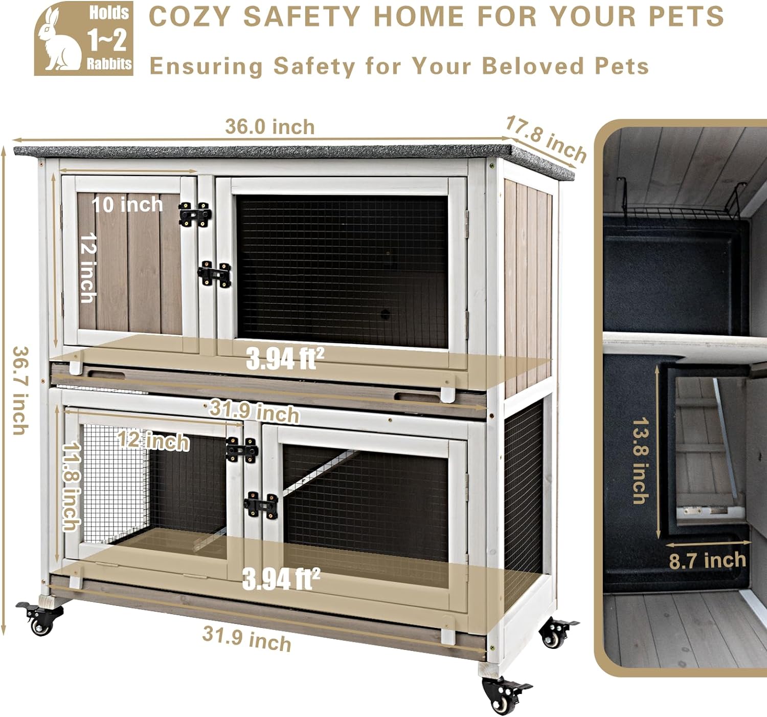 36" L Rabbit Hutch Indoor with 4 Metal Wheels, 2-Story Wooden Bunny Hutch Outdoor Bunny Cage, 2 Deeper Pull-Out Trays, Ramp, Rabbit Cage Guinea Pig Pet House for Small Animals
