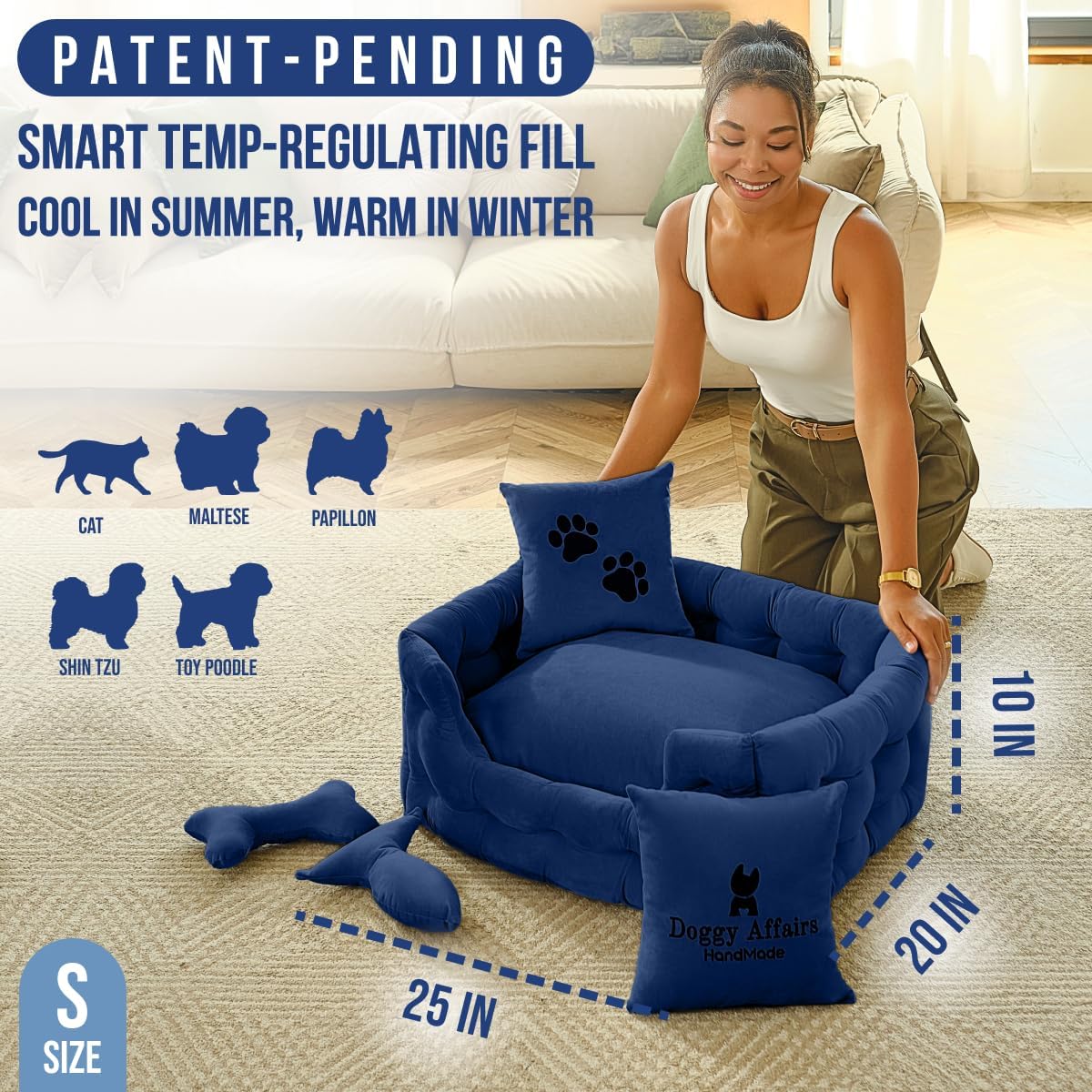- JOINT SUPPORT COMFORT & TEMP REGULATION: Premium cushioning supports joints, hips, and growing bones, while smart fill keeps her cool in summer and warm in winter. The only calming dog bed that truly hugs her back like your arms.