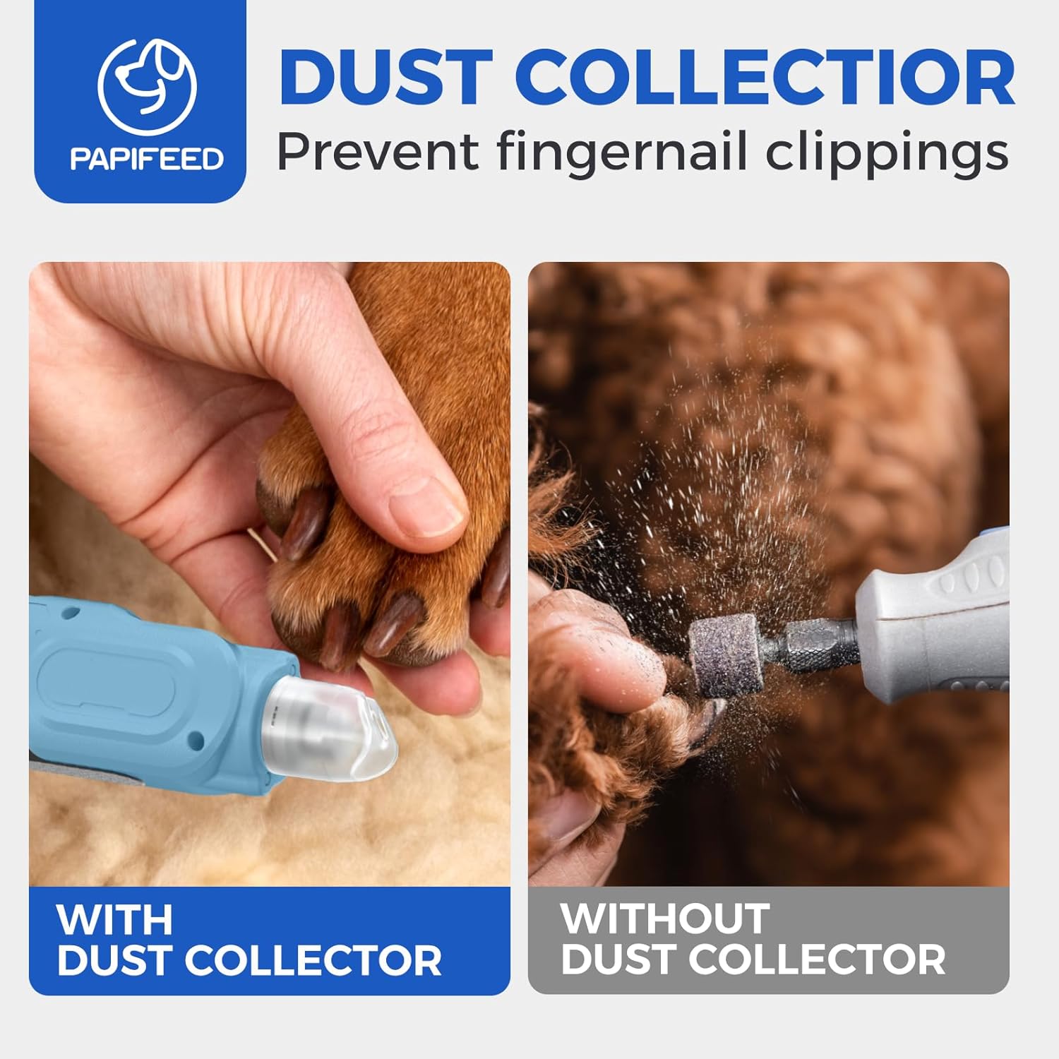 - 【Dust-Proof Splash Guardz】PAPIFEED dog nail clippers adopts an exclusive transparent dust cover design to capture grinding debris in real time and prevent nail dust from flying everywhere.Hygienic cleaning is clear at a glance, protecting the health of you and your pet while reducing the burden of household cleaning.